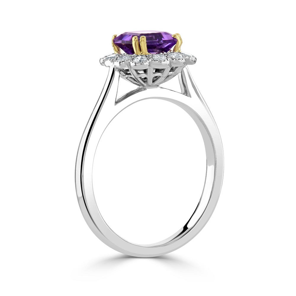 This luxurious ring combines the warm tones of 18ct yellow gold with the sleekness of white gold, creating a striking contrast that enhances the sparkle of the diamonds and the rich colour of the amethyst. The cushion-shaped cluster design not only provides a substantial look but also ensures that this ring makes a bold statement on any occasion.