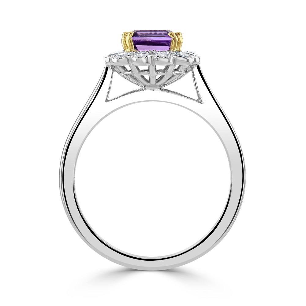 Our beautiful 18ct yellow and white gold cushion shaped cluster ring features a sophisticated step cut amethyst as its centrepiece. The amethyst, weighing 1.00 carat, is exquisitely set in a claw setting that highlights its deep, vibrant hues and precise facets. Surrounding this majestic purple gemstone are twelve rubover-set round brilliant-cut diamonds totalling 0.32 carats, each framed with a delicate milgrain edge that adds a touch of vintage elegance.