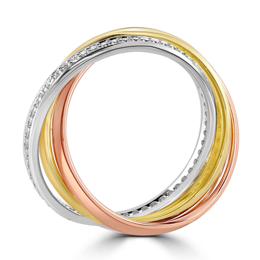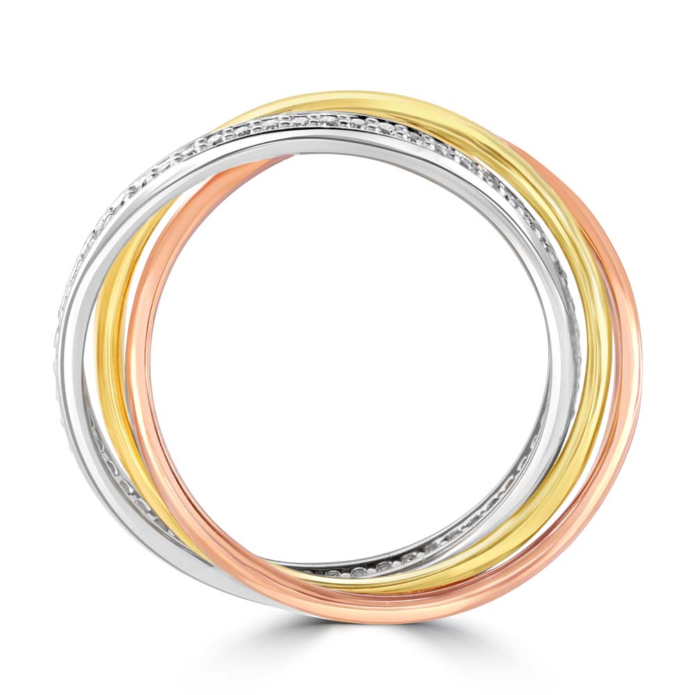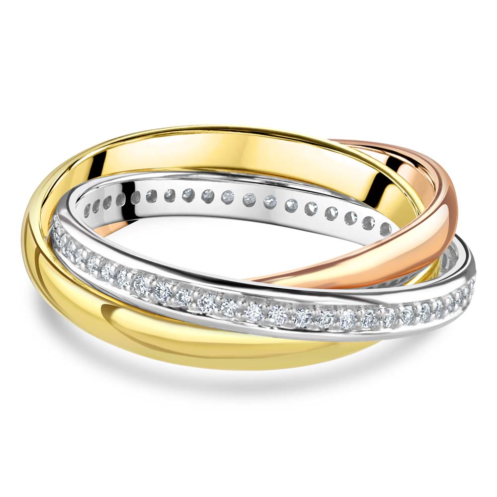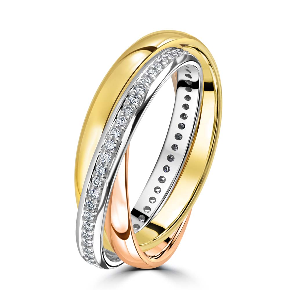 Celebrate your love with this unique three band wedding ring. Featuring a harmonious blend of a plain 18ct yellow gold band, a plain 18ct rose gold band, and a dazzling 18ct white gold band set with sparkling diamonds. With a total diamond weight of 0.28ct, this ring beautifully combines elegance and modern design, making it a perfect symbol of your enduring commitment.