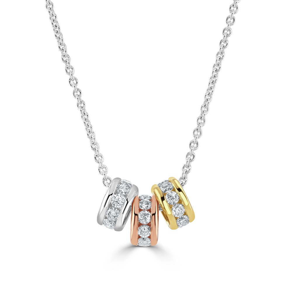 Introducing our exquisite 18ct yellow, white, and rose gold pendant, a striking piece that elegantly showcases the harmony of mixed metals. This pendant features three roundels—each crafted from yellow, white, and rose gold—beautifully channel set with round brilliant cut diamonds. The total diamond weight of this stunning piece is 1.00 carat, reflecting exceptional clarity and brilliance. Each roundel is interconnected, symbolizing unity and balance, and hangs from an 18ct white gold trace chain that is 17.5 inches in length, adjustable to 16.5 inches for versatile styling. Ideal for those who appreciate sophisticated design and a splash of luxury, this tri-colour gold pendant is perfect for special occasions or adding a touch of glamour to your everyday look.