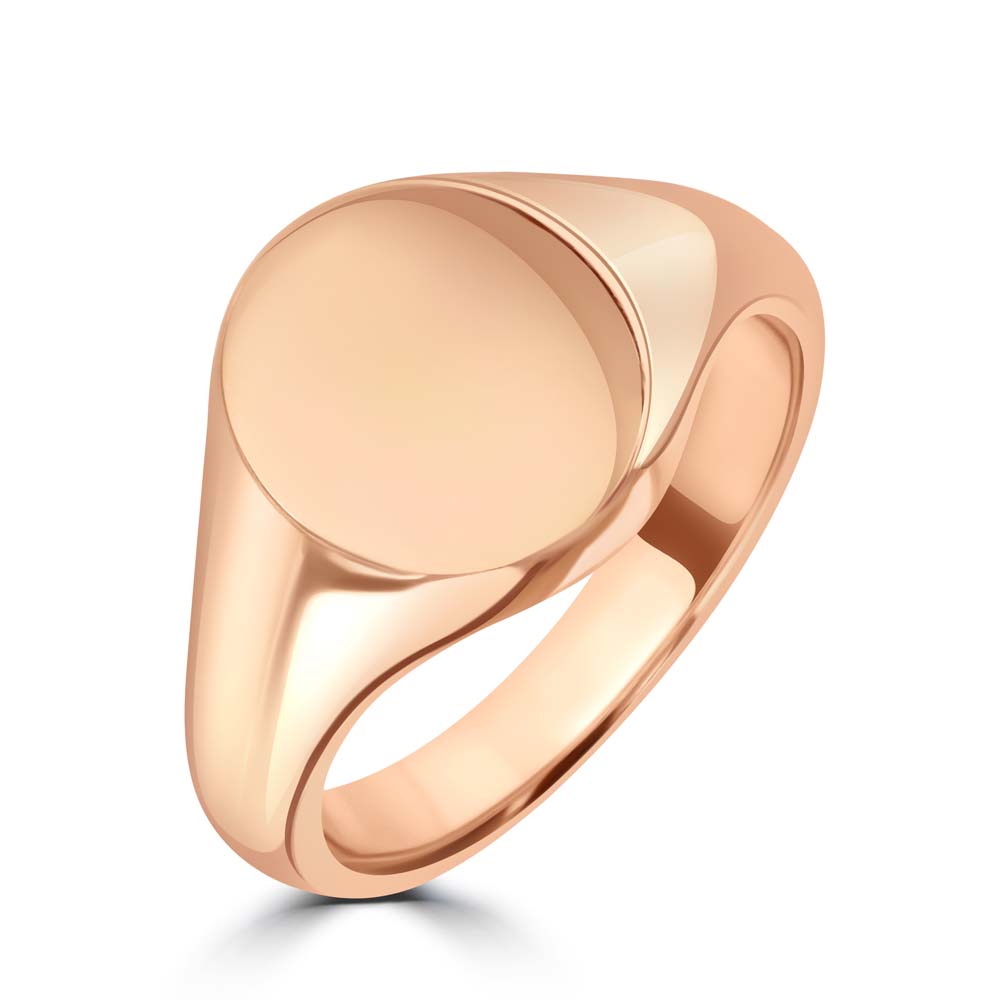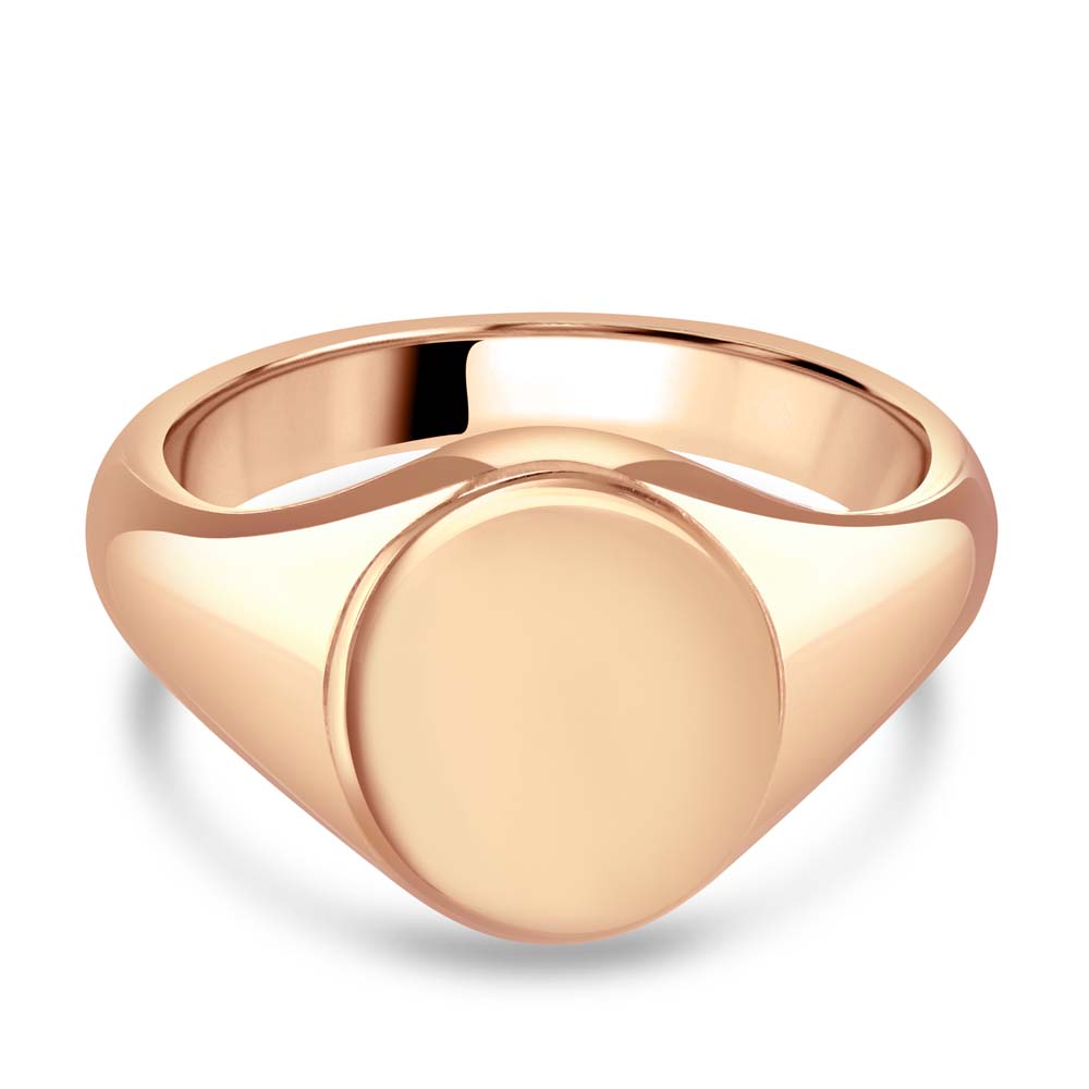 An exquisite 9ct rose gold oval signet ring, the perfect blend of classic elegance and personal expression. This meticulously crafted ring features a smooth, oval face, providing an ideal canvas for seal engraving with your cherished family crest or your initials. Crafted from premium 9ct rose gold, this signet ring embodies timeless beauty and durability, ensuring it can be worn and appreciated for generations to come. Its understated design makes it a versatile piece, suitable for everyday wear or special occasions, allowing you to carry a piece of your heritage or personal identity with you at all times. Whether you're looking to commemorate your family history or celebrate your individuality, this plain horizontal oval signet ring offers a unique opportunity to create a meaningful, custom piece that will be treasured forever.