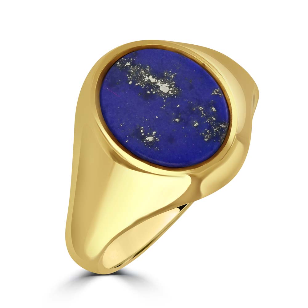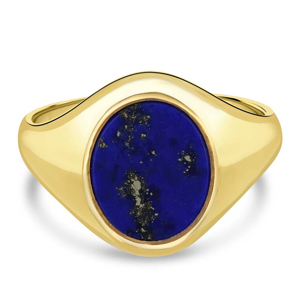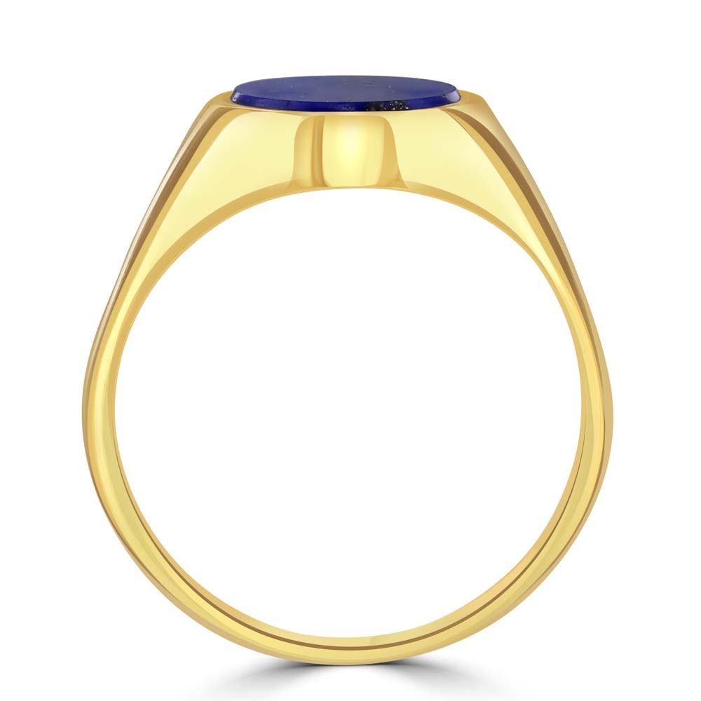 A deep celestial blue 9ct yellow gold signet ring, featuring a majestic oval-shaped lapis lazuli. This exquisite ring combines the timeless allure of yellow gold with the rich, symbolic beauty of lapis lazuli, offering a piece that radiates regal elegance and sophistication. Perfect for those who seek a blend of classic style and meaningful gemstone presence, this lapis lazuli signet ring is a distinguished choice. Elevate your collection with the luxurious charm and unique character of our lapis lazuli signet ring, a symbol of nobility and wisdom.