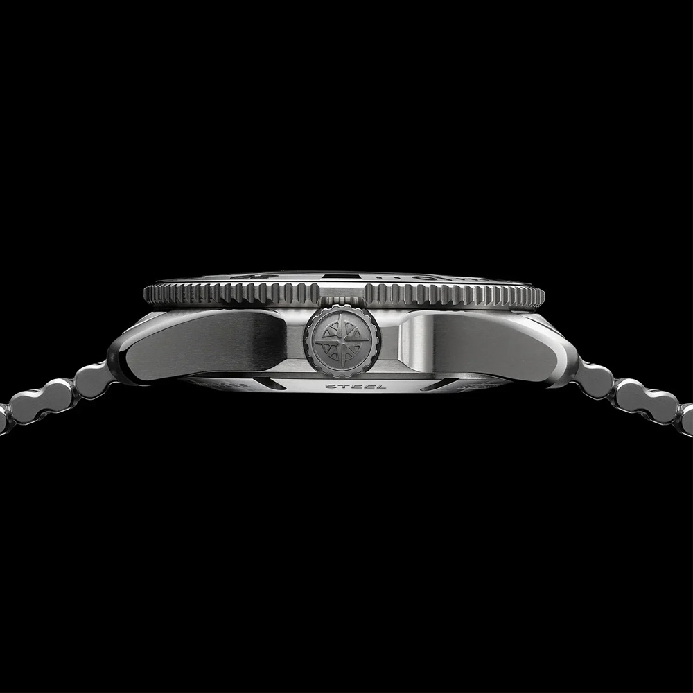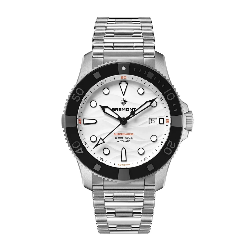 The Supermarine 500m marks a bold new chapter in Bremont’s professional dive watch collection. Crafted in 904L stainless steel, the 43mm case features a slimmer, more ergonomic profile with enhanced crown and bezel guards for added durability. Designed to withstand the pressures of deep-sea diving, it boasts a 500-metre water resistance rating, a helium escape valve, and a textured black ceramic uni-directional bezel.