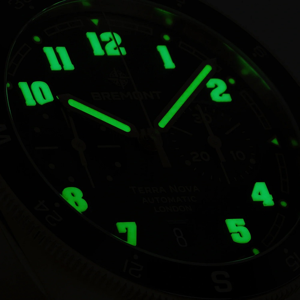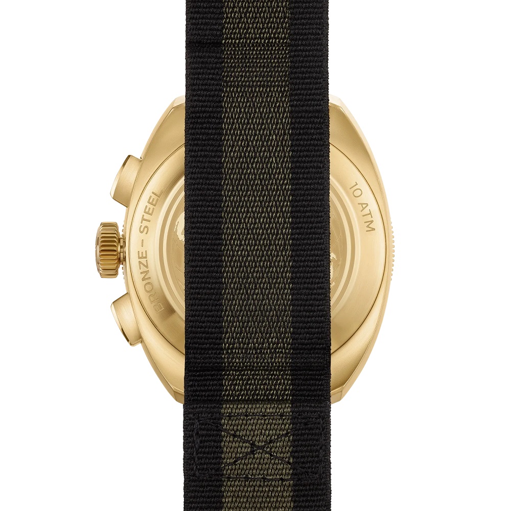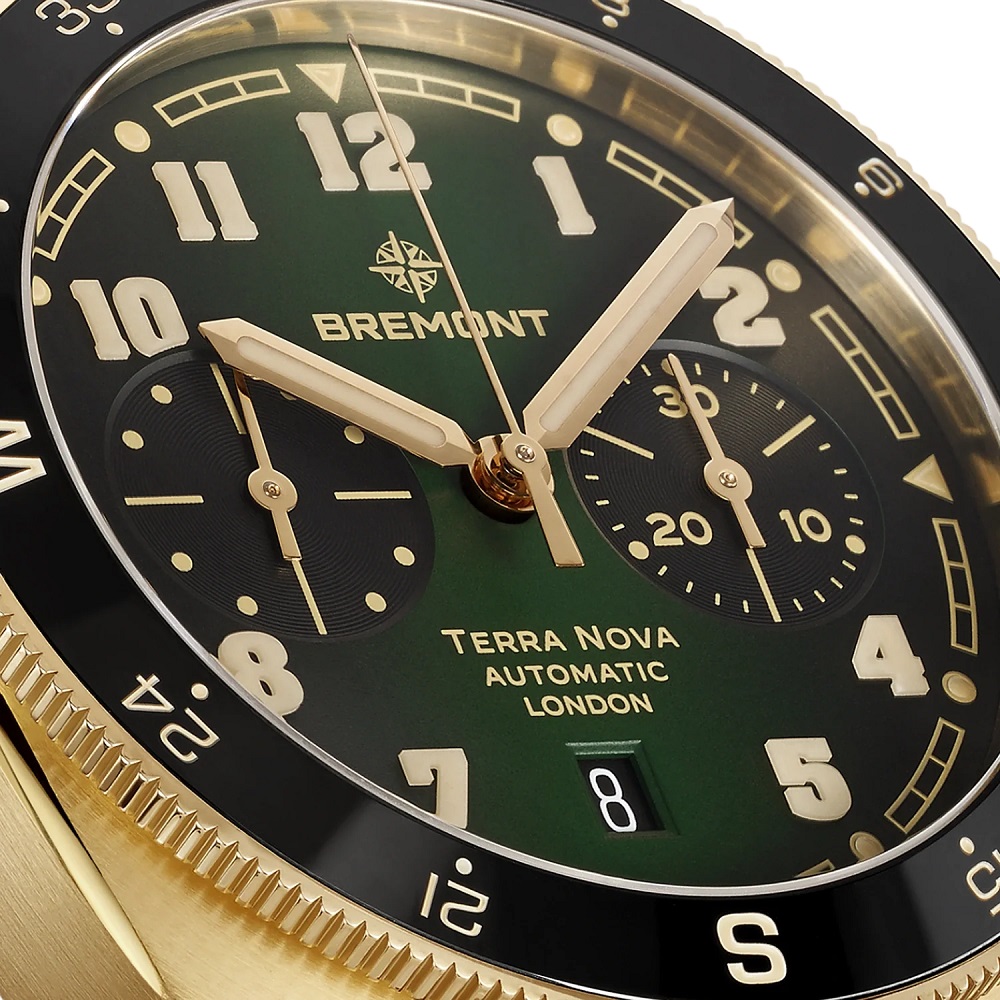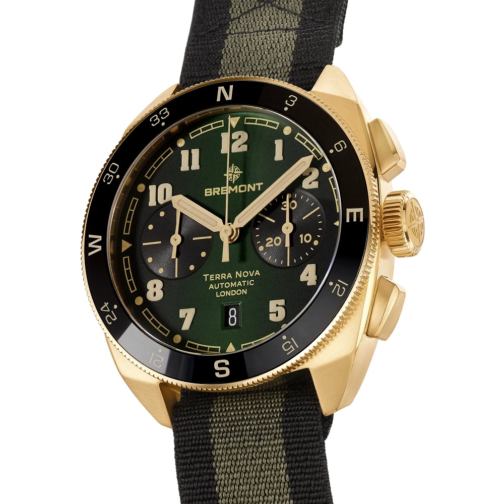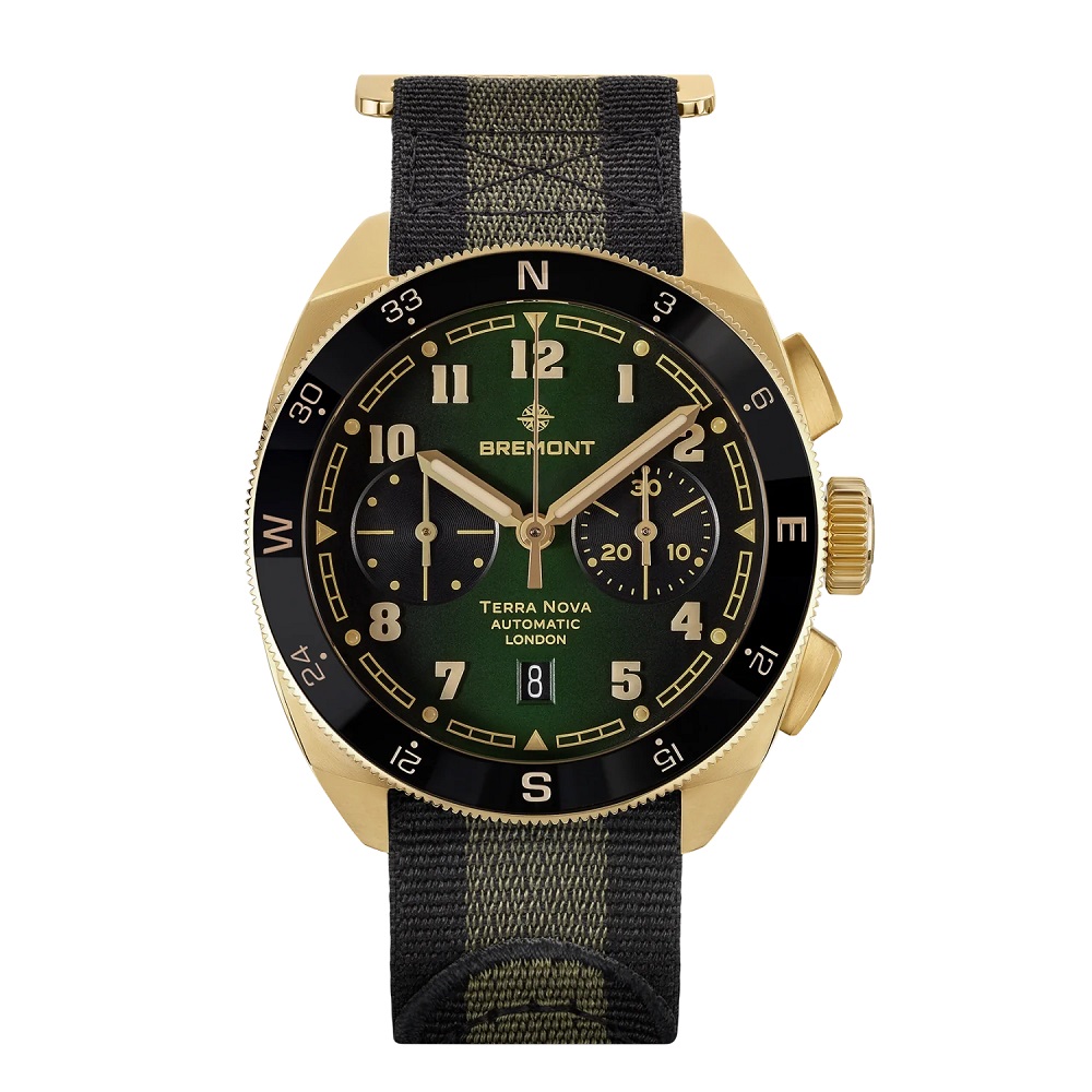 The Terra Nova Chronograph Bronze is the most technically advanced model in the collection, built for precision timing and rugged durability. The 42.5mm Cupro-Aluminium bronze case, reinforced with aluminium and silicon, offers superior scratch resistance and hypoallergenic properties while developing a smooth, even patina over time. Its bi-directional bronze compass bezel with a black ceramic insert enhances functionality, making it a versatile tool for both navigation and timekeeping. 100-metre water resistance ensures protection against the elements. The deep green gradient dial delivers contrast and clarity, featuring refined full-block Super-LumiNova® numerals for exceptional legibility. The chronograph complication includes a central sweep seconds hand, a 30-minute counter at 3 o’clock, and a date display at 6 o’clock, powered by the Chronometer-rated Calibre BE-50AV automatic movement. With a 56-hour power reserve, this high-performance movement ensures accuracy and endurance for any expedition. This model is available on a black and green NATO strap with PVD bronze-coloured stainless steel loop.