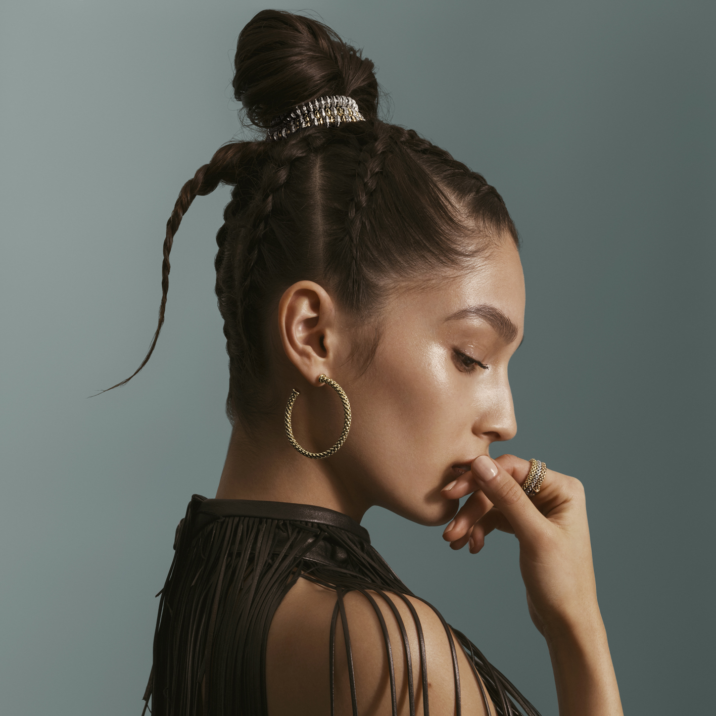 For 2021, a highlight is the new Essentials collection; a range of 18ct gold rings and earrings that can be worn alone or stacked together, with three sizes of classic hoop earrings and new sleek Flex’it mesh earrings in gold and with diamonds.