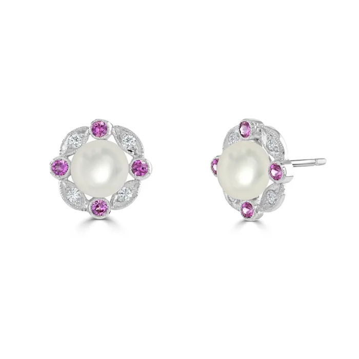 The sparkling diamonds and vibrant pink sapphires enhance the lustre of the central pearl, creating a dazzling halo effect. Each gemstone complements the others, set in polished 18ct white gold that adds a touch of sophistication to the overall design. The earrings are equipped with reliable post and butterfly fittings, ensuring they are secure and comfortable for pierced ears.