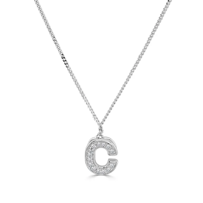 Our dazzling 9ct white gold 'C' pendant is elegantly sprinkled with diamonds to create a look of timeless sophistication. This exquisite pendant is crafted from premium 9ct white gold, providing a luxurious and bright finish that complements the shimmering diamonds beautifully.