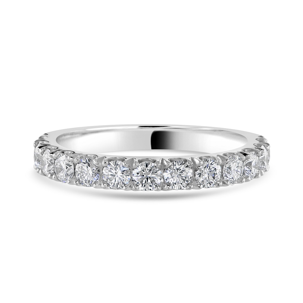 Celebrate timeless elegance with this platinum half eternity ring, expertly crafted for lasting beauty and sophistication. Featuring 15 round brilliant-cut diamonds in a classic castle claw setting, this design maximizes light exposure for exceptional sparkle and brilliance. With a total diamond weight of approximately 0.60ct, each stone is hand-selected for quality and radiance, making this ring an ideal choice for a wedding band, anniversary gift, or a luxurious stacking piece. The strength and purity of platinum ensure durability and a sleek, modern finish that complements any style.