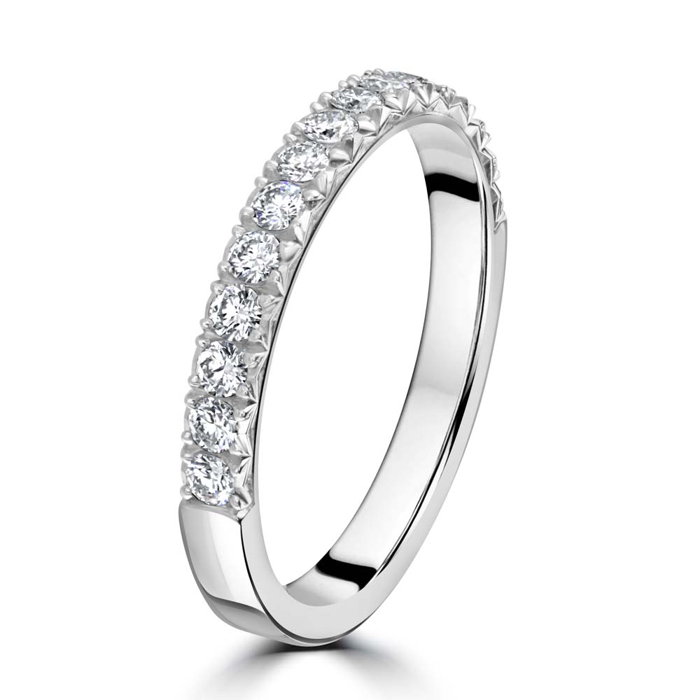 Discover the elegance of our platinum eternity ring, showcasing a 2.5mm flat court-shaped band for a comfortable fit. This luxurious ring features 15 meticulously set round brilliant cut diamonds, each held securely in a classic 4-claw setting. With a total diamond weight of 0.37 carats, this ring radiates a captivating sparkle. Ideal for marking significant milestones or adding a touch of sophistication to your jewellery collection, this platinum eternity ring embodies timeless beauty and refined craftsmanship. The durable platinum band enhances the brilliance of the diamonds, creating a perfect blend of luxury and elegance.