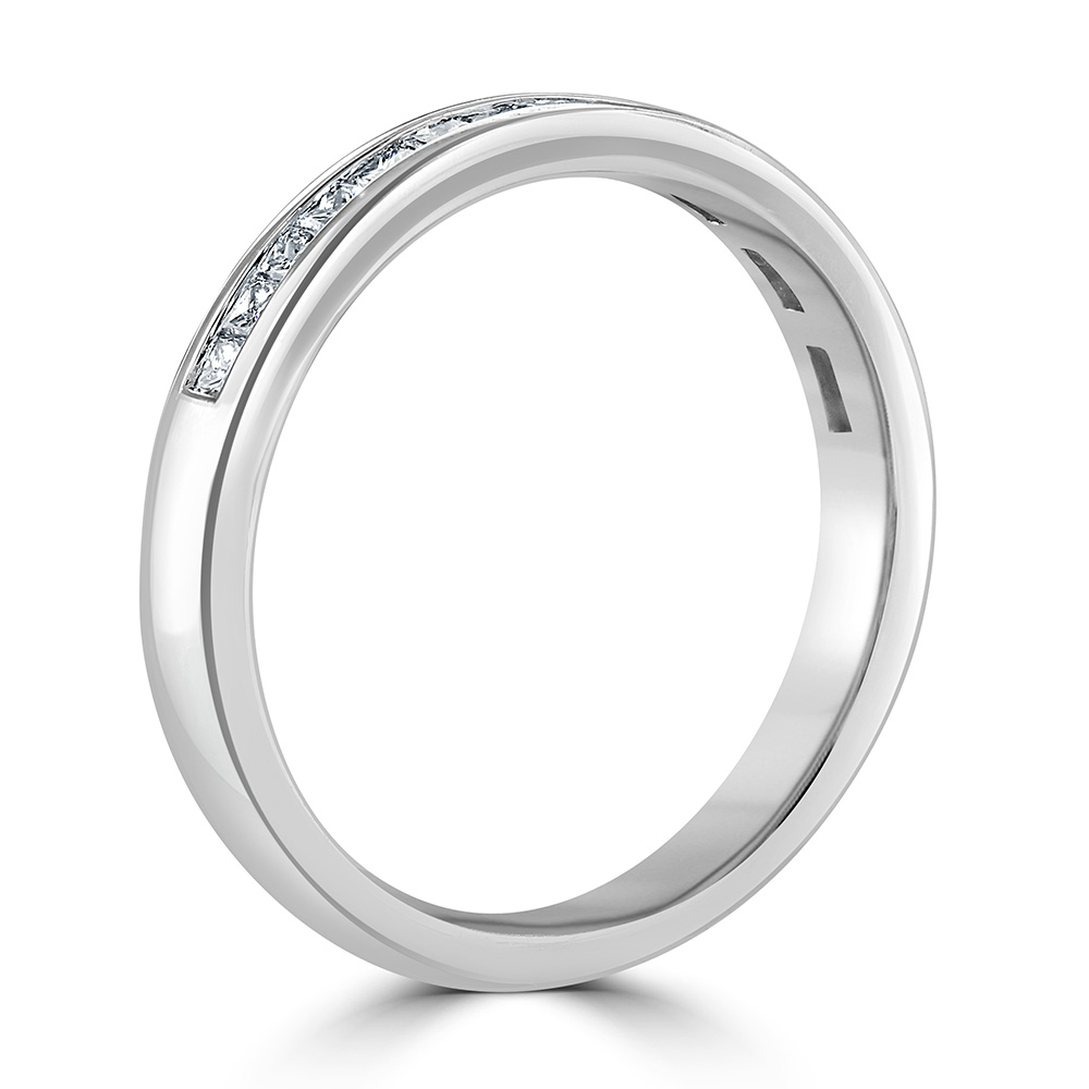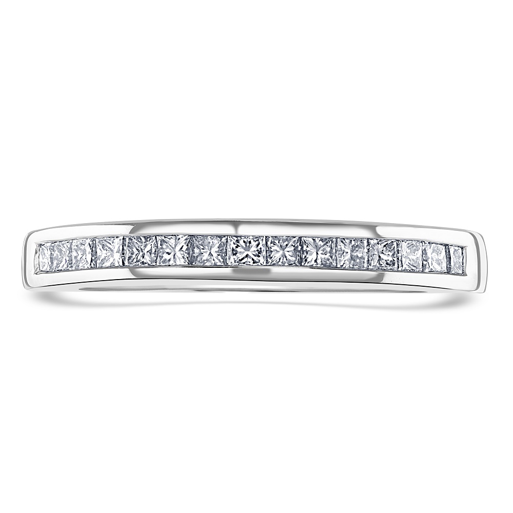 Featuring a channel set that holds 15 princess-cut diamonds, this ring offers a modern twist on the traditional eternity ring. The diamonds, with a total weight of 0.33 carats, are cut in the distinctive princess shape that maximizes their brilliance and fire. The channel setting not only secures each diamond tightly but also creates a smooth, unbroken surface across the band, which is both comfortable and visually stunning.