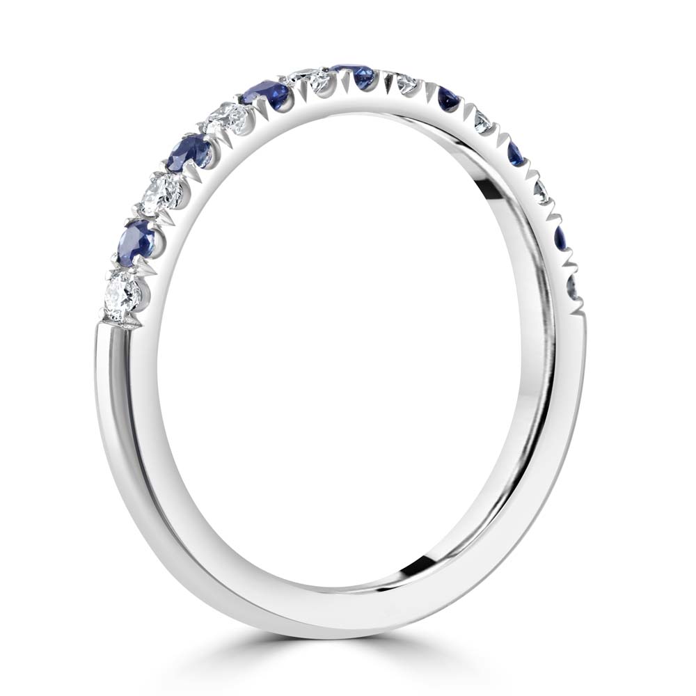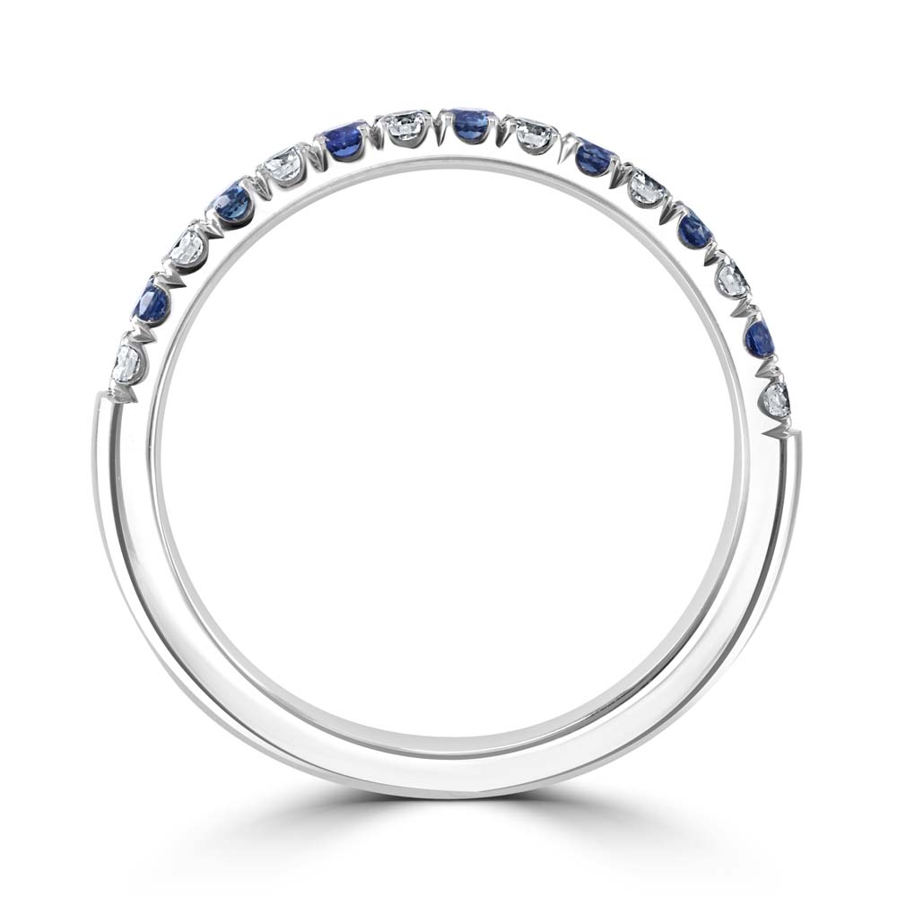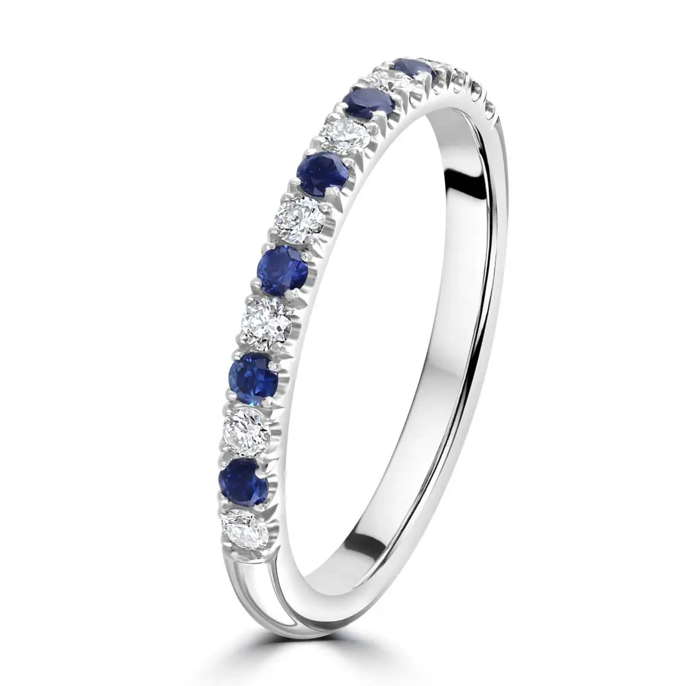 Discover the timeless elegance of our platinum half eternity ring, featuring a captivating arrangement of alternating claw-set gemstones. This exquisite ring showcases seven round sapphires and eight round brilliant cut diamonds, each meticulously set to ensure maximum brilliance and sparkle. With both the total sapphire weight and total diamond weight at 0.14 carats each, this ring offers a harmonious balance of vibrant colour and dazzling light. Perfect for celebrating life's special moments or adding a touch of sophistication to your jewellery collection, this platinum half eternity ring combines luxurious design with exceptional craftsmanship. The durable platinum band beautifully enhances the rich blue sapphires and the sparkling diamonds, creating a piece that symbolizes enduring love and elegance.