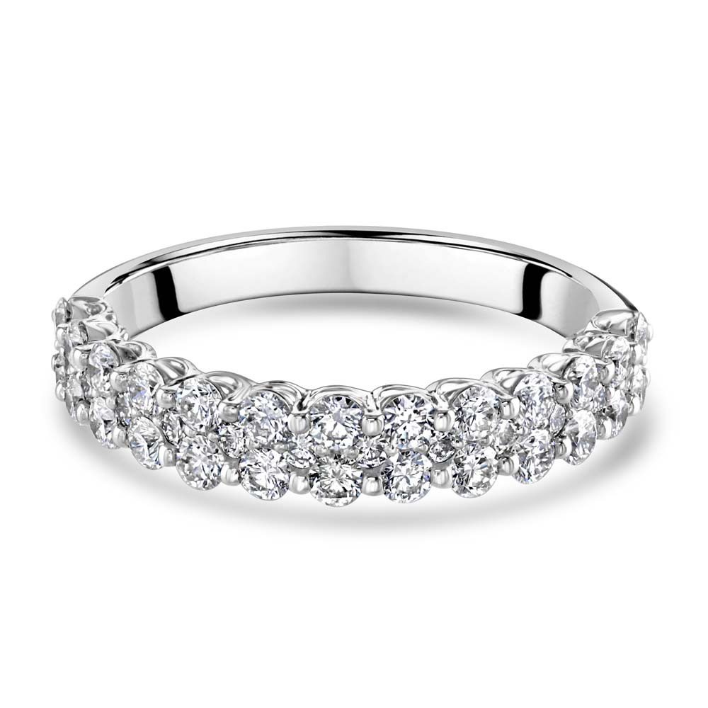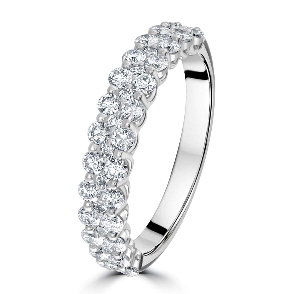 Immerse yourself in the timeless beauty of our platinum half eternity ring, meticulously crafted to feature two stunning rows of claw-set round brilliant cut diamonds. This sophisticated design showcases a total of 26 diamonds, each carefully selected for its brilliance and clarity. With a combined diamond weight of 0.97 carats, this ring ensures a dazzling sparkle that captures and reflects light beautifully, making it an eye-catching addition to any jewellery collection. Ideal for celebrating life's most cherished moments, this platinum half eternity ring is perfect for anniversaries, milestone celebrations, or simply as a token of everlasting love. The dual rows of diamonds offer a luxurious and striking appearance, while the secure claw settings provide both elegance and durability. The high-quality platinum band enhances the radiance of the diamonds, creating a harmonious blend of strength and beauty. This exquisite ring is not just a piece of jewellery; it's a symbol of enduring love and commitment. The exceptional craftsmanship and attention to detail ensure that this ring will be a treasured heirloom, passed down through generations. Its classic yet contemporary design makes it versatile, suitable for both everyday wear and special occasions.