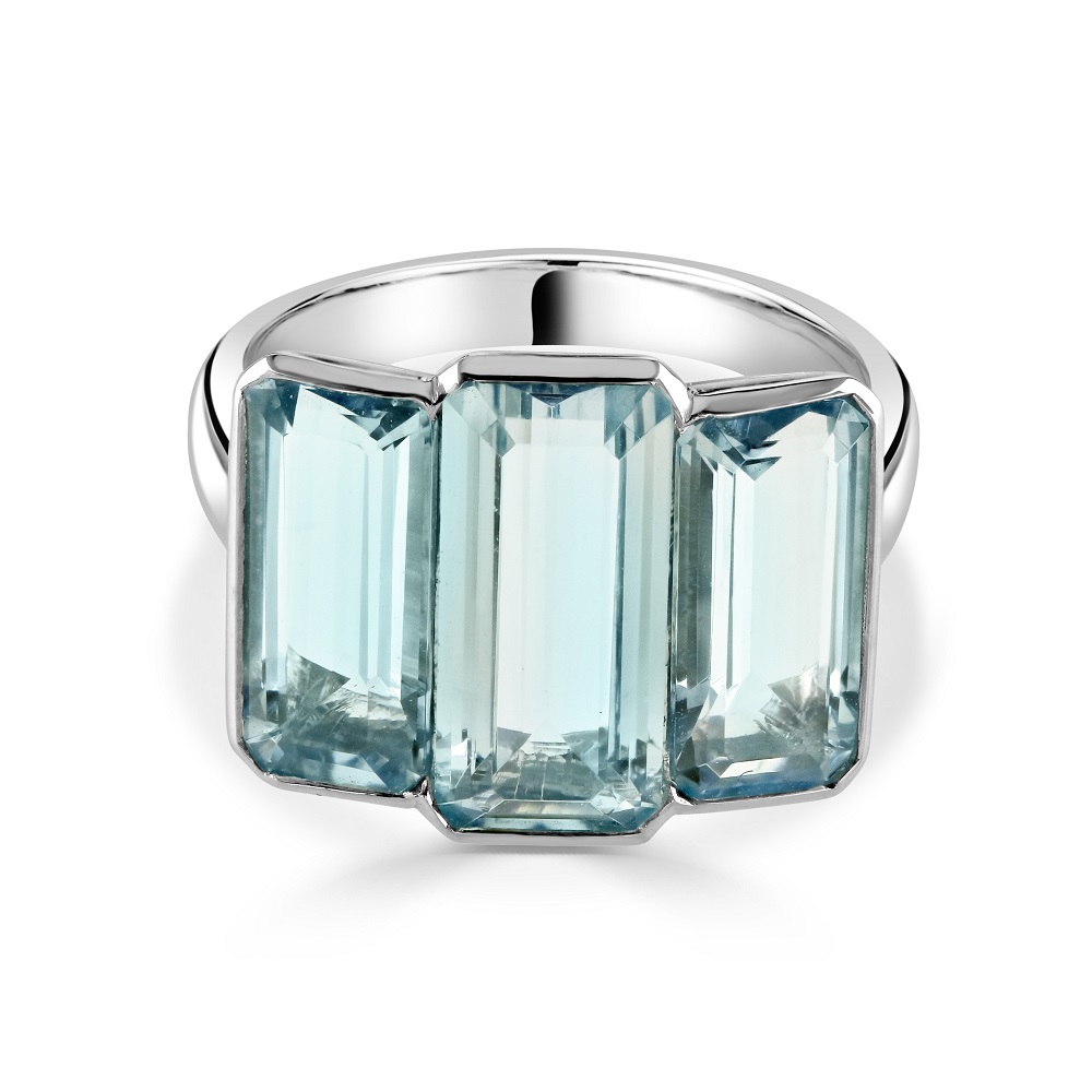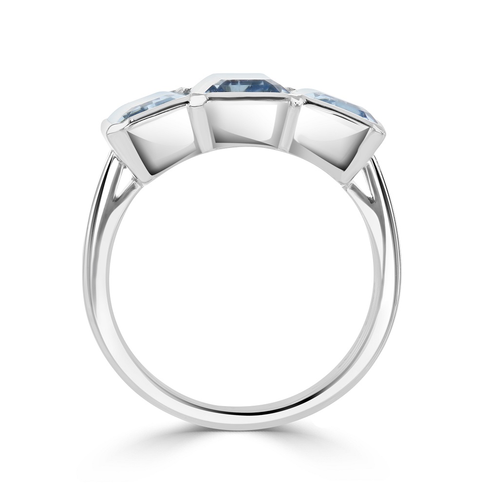 An elegant platinum three gemstone ring, exclusively designed with rubover-set rectangular cut aquamarines. Boasting a total aquamarine weight of 5.81ct, this masterpiece combines luxury with sophistication. Each aquamarine is meticulously selected to ensure the ring's unparalleled beauty and allure, making it a standout addition to any jewellery collection. Perfect for those who cherish timeless elegance, this platinum ring encapsulates the perfect blend of modern design and classic charm.