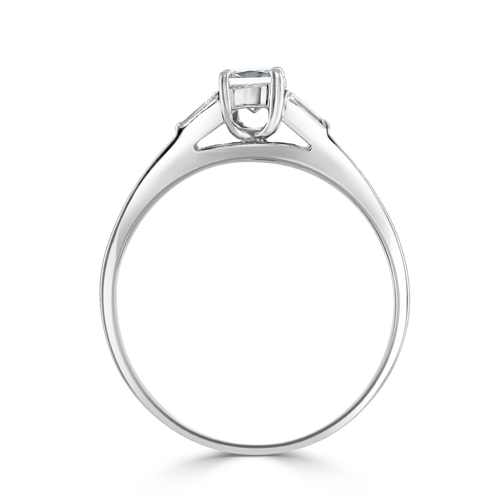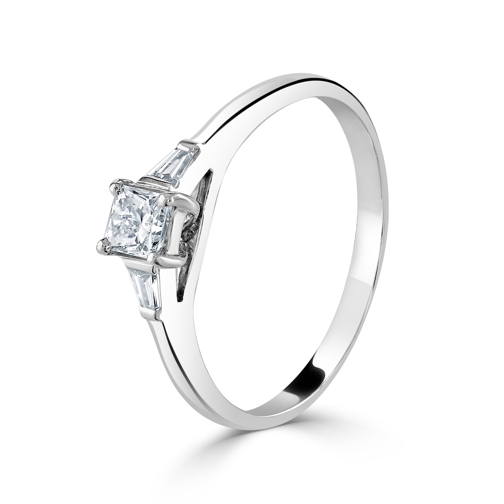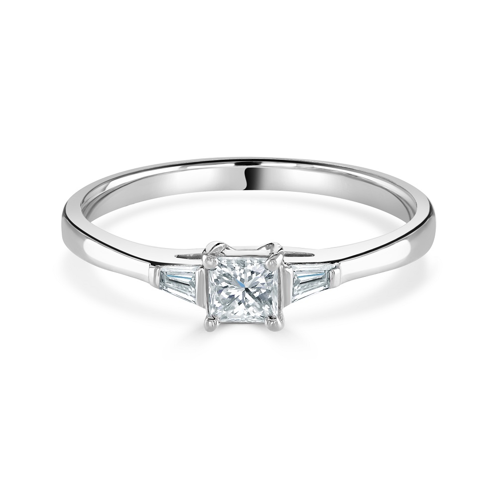 An alluring platinum trilogy diamond ring. This luxurious ring features a stunning princess cut diamond at its centre, renowned for its sharp angles and exceptional brilliance. Flanked by two gracefully tapered baguette cut diamonds on either side, this design creates a seamless harmony of light and geometry.