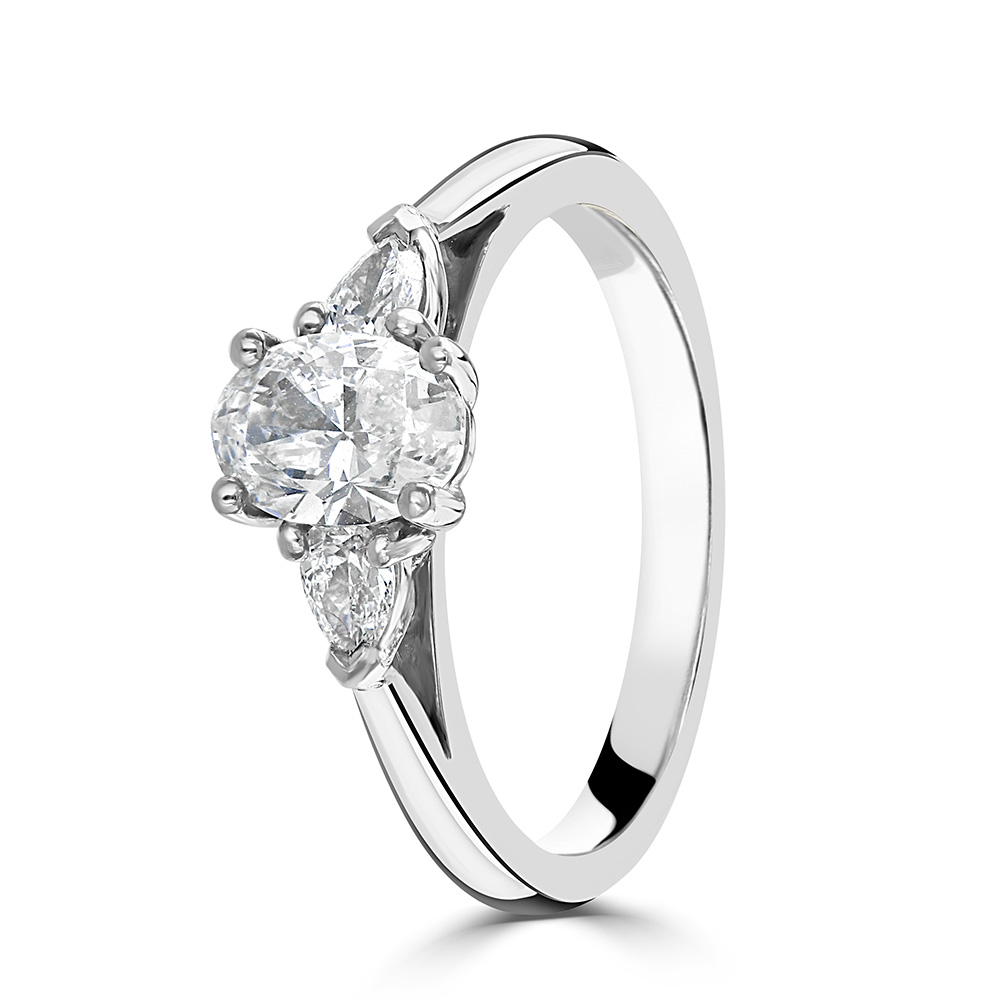 Crafted from the finest platinum, this trilogy ring offers not only a sleek and durable setting but also a symbol of enduring love and commitment. The unique combination of diamond cuts – the central oval flanked by elegant pears – presents a sophisticated silhouette that’s both modern and timeless.