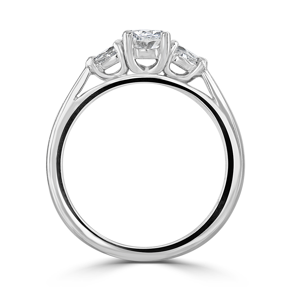 An elegant platinum trilogy ring, a testament to timeless beauty and sophisticated design. At the heart of this exquisite piece lies a GIA-certified oval cut diamond, weighing 0.70ct, majestically set with four claws. This centre diamond boasts an impeccable F colour and VS2 clarity, ensuring a display of brilliance and purity. Flanking this stunning gemstone, two pear cut diamonds, with a combined weight of 0.21ct, gracefully complement the central stone, creating a harmonious and captivating design.