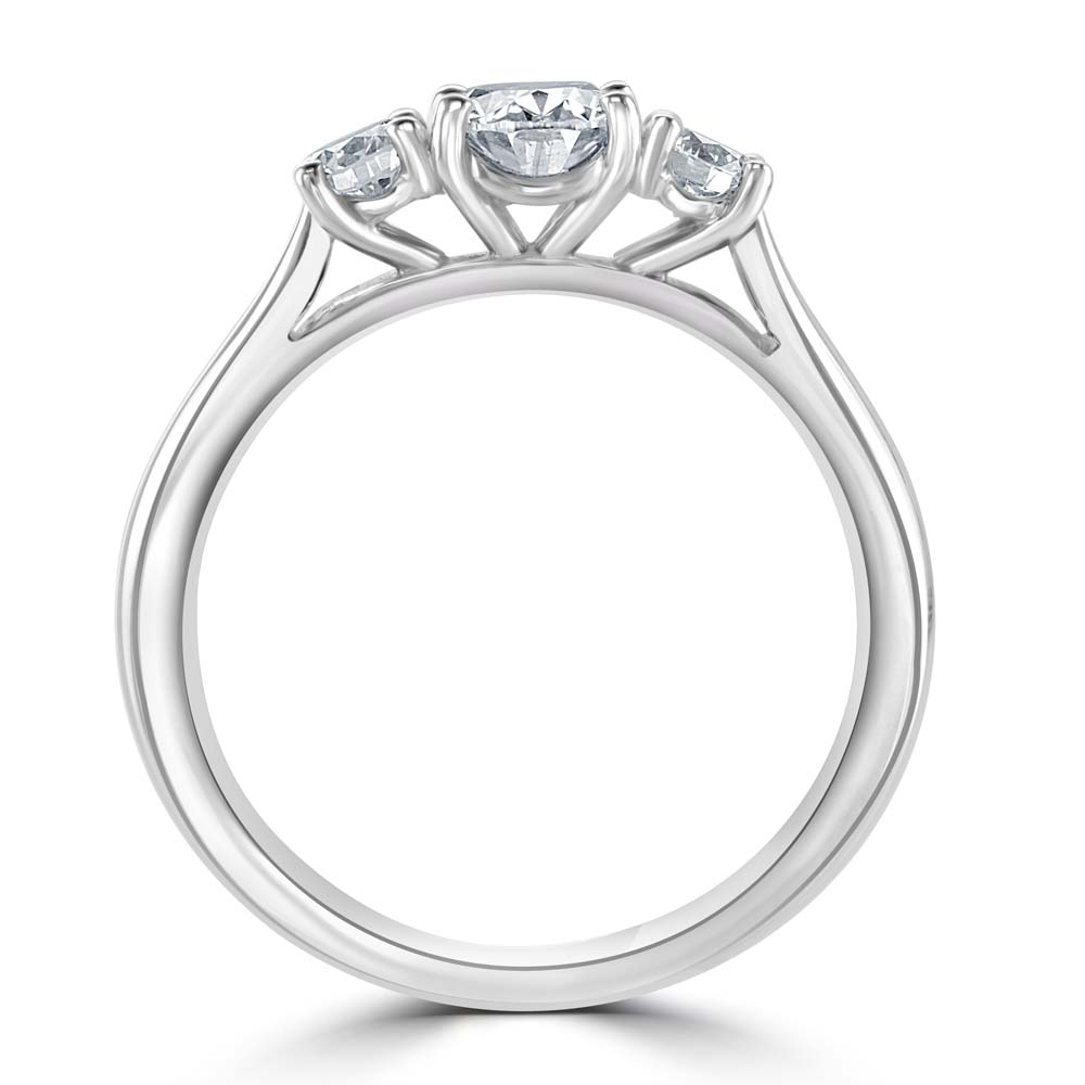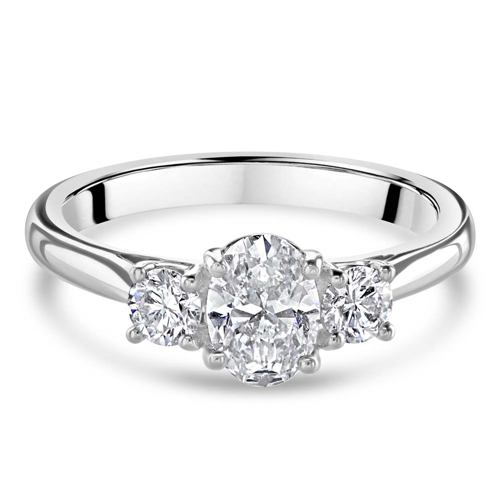 Discover the timeless elegance of our platinum trilogy ring, featuring a stunning oval cut diamond set in a secure four-claw setting at the centre. This exquisite design is complemented by a single round brilliant cut diamond claw set on either side, creating a harmonious and captivating display of brilliance. The centrepiece of this luxurious ring is a GIA-certified oval cut diamond, weighing 0.70 carats. With a G colour grade, the diamond offers near-colourless brilliance that captures the eye. The VS2 clarity grade ensures exceptional sparkle, with inclusions that are only visible under magnification, allowing the diamond’s natural beauty to shine through. The two round brilliant cut diamonds on either side further enhance the ring’s overall radiance and sophistication. Crafted from premium platinum, this trilogy ring combines timeless beauty with enduring durability. The classic three-stone design symbolizes the past, present, and future of your love story, making it a perfect choice for engagements, anniversaries, or any significant celebration. Ideal for those who appreciate refined elegance and exceptional craftsmanship, this platinum trilogy ring is a true symbol of everlasting love.
