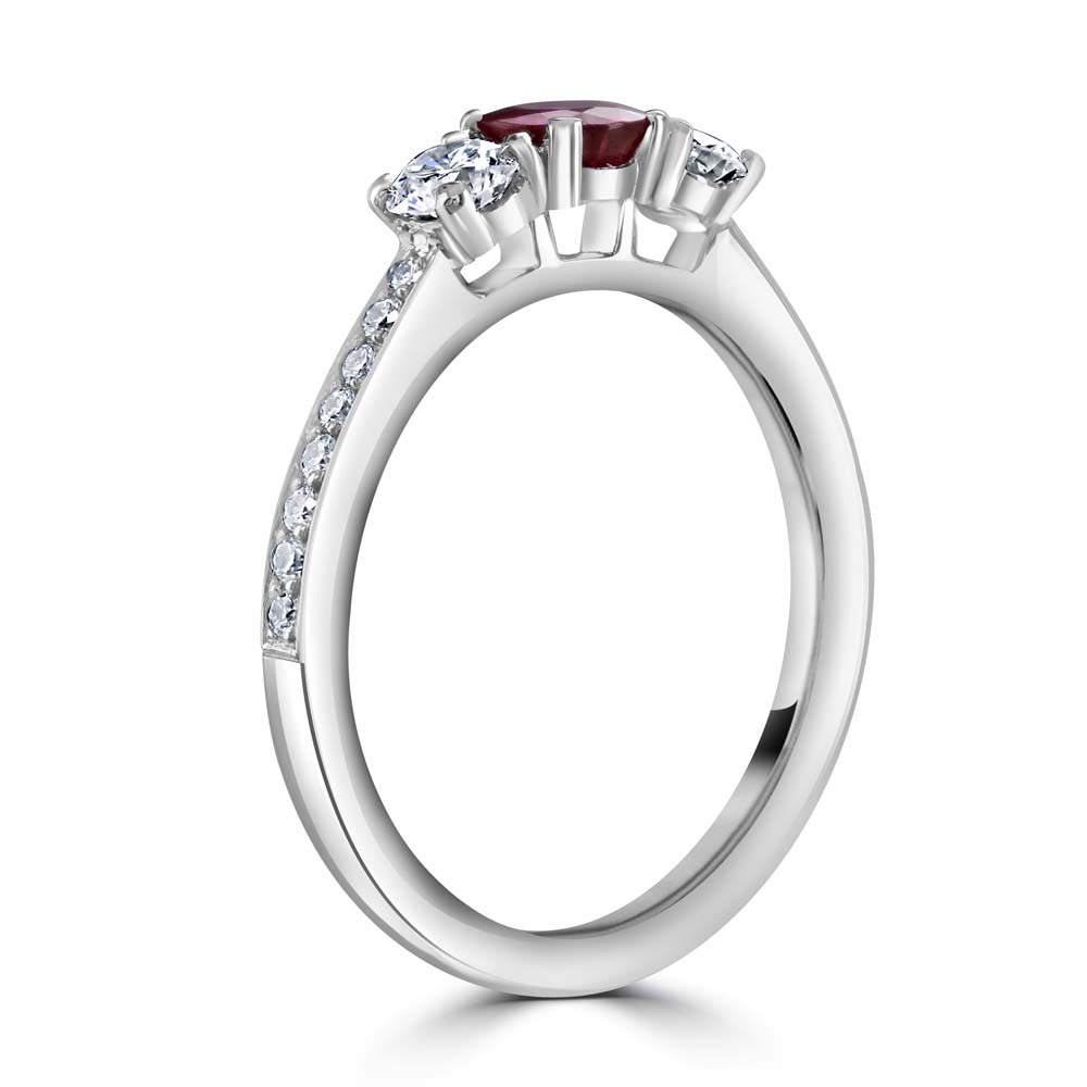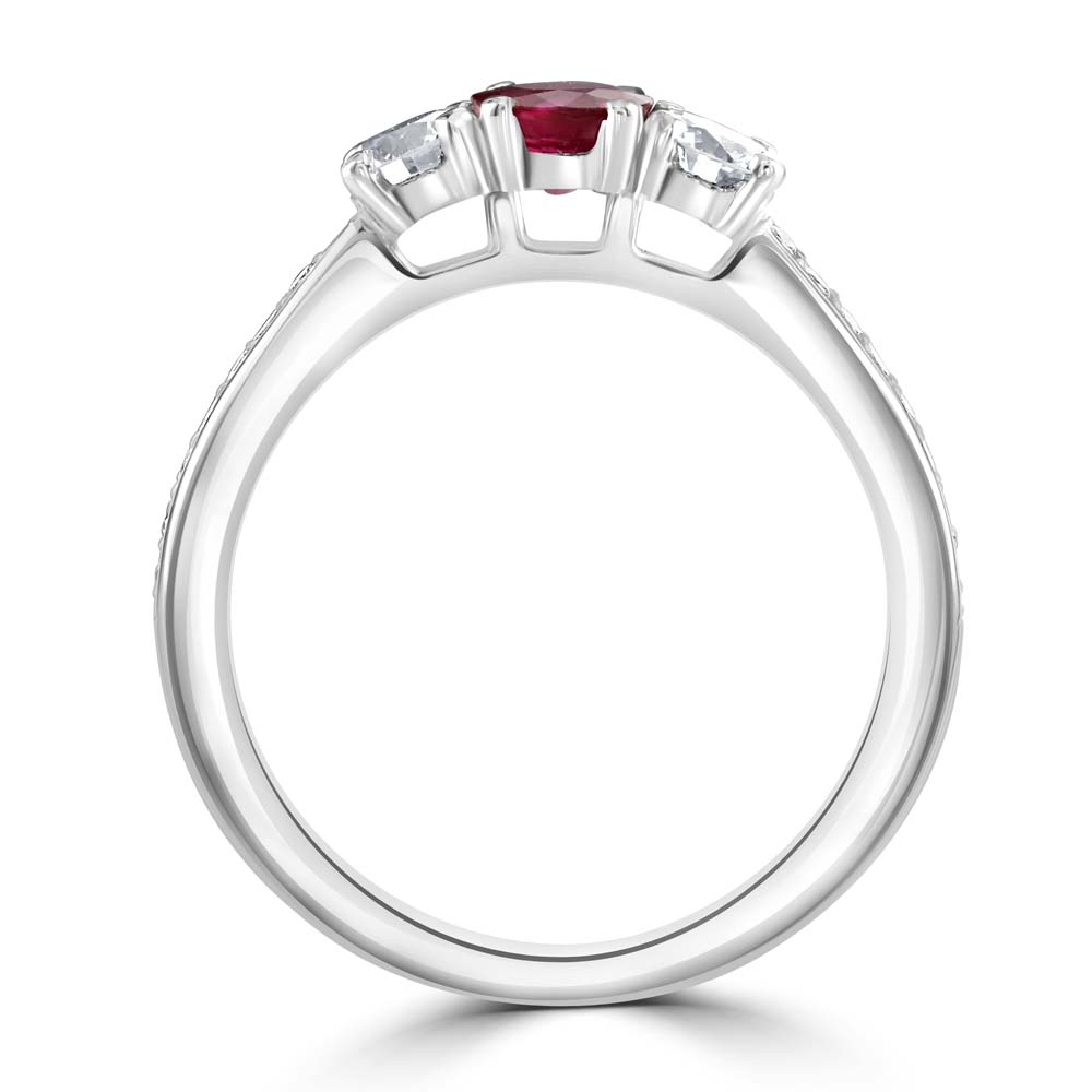 An elegant platinum trilogy ring, masterfully crafted with a captivating centre claw-set round ruby. Flanked on either side by dazzling claw-set round brilliant-cut diamonds, this exquisite piece embodies timeless sophistication. The ring's shoulders are intricately adorned with diamond settings, enhancing its splendour and allure. Perfect for those seeking a statement piece that combines the classic beauty of rubies and the unmatched brilliance of diamonds, all set in a platinum band.