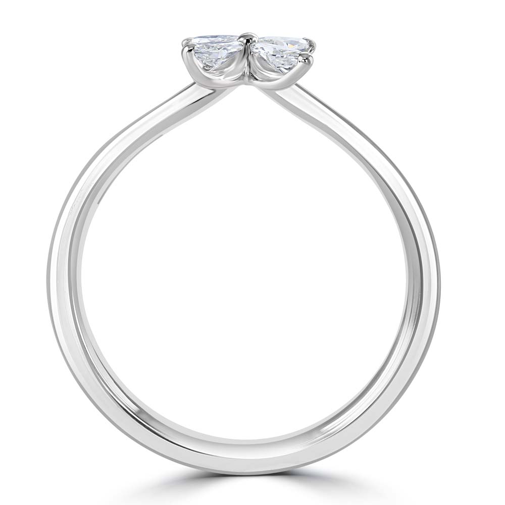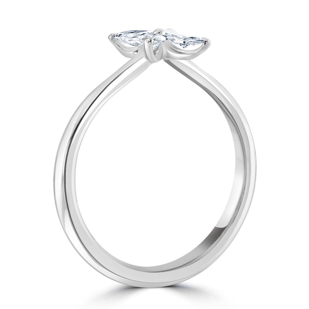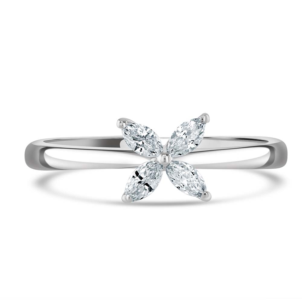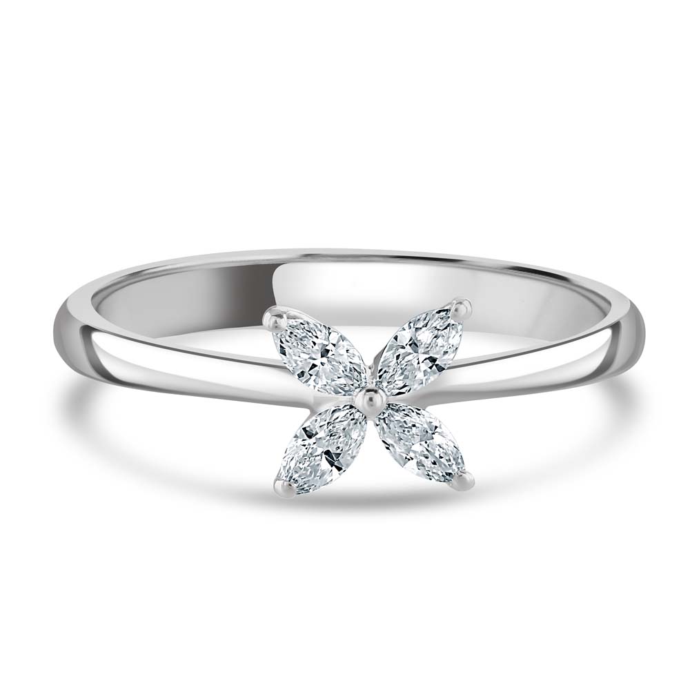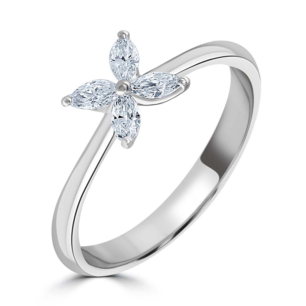 Our exquisite platinum flower ring is a symbol of elegance and sophistication that seamlessly blends natural beauty with timeless design. This stunning ring features a captivating floral motif crafted from platinum, renowned for its durability and sleek finish. The design highlights four marquise-cut diamonds, each meticulously held in place by a four-claw setting that enhances their elongated shape and brilliant sparkle.