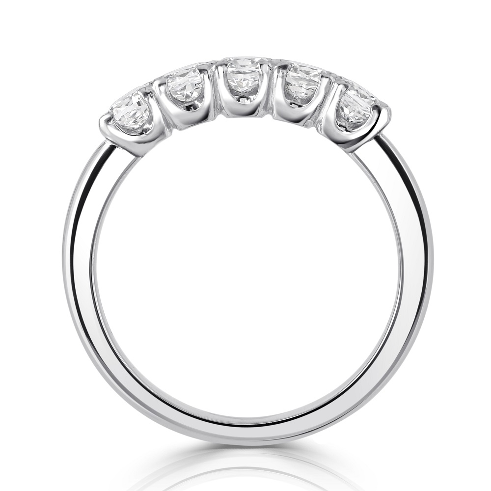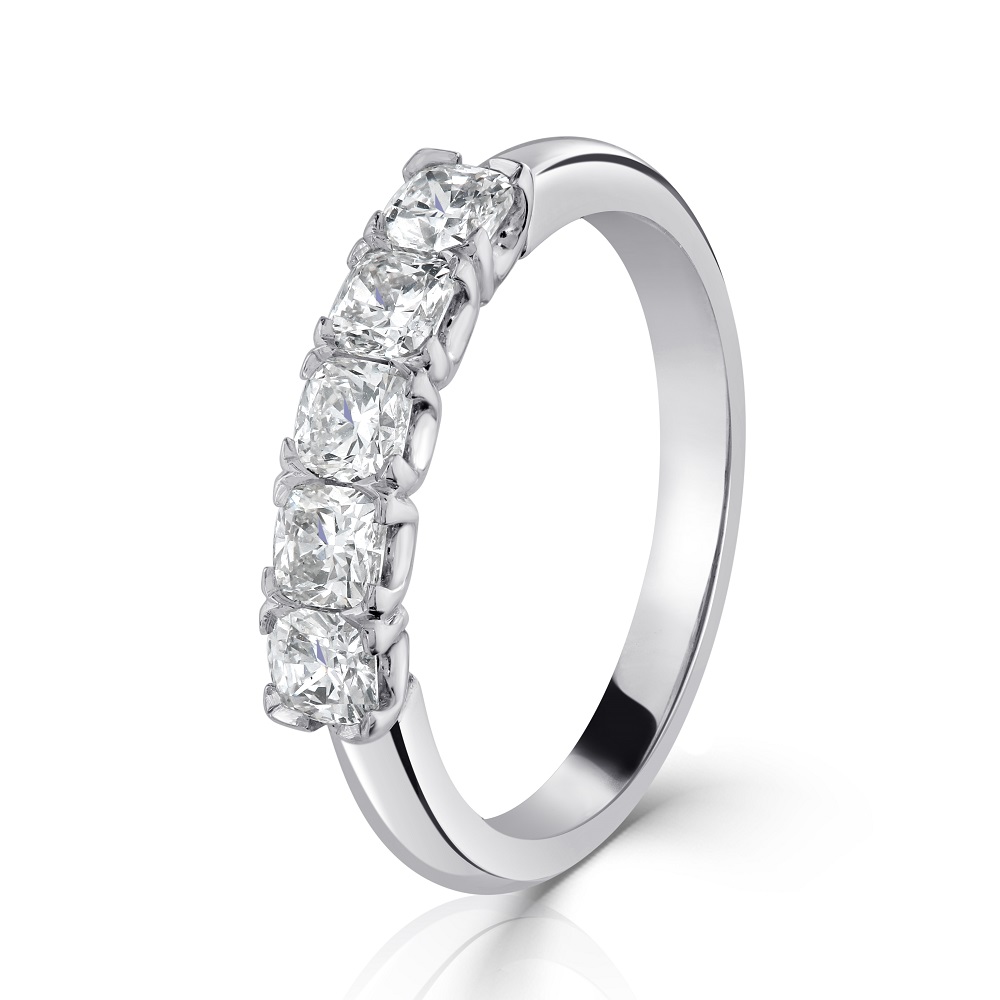 This gorgeous eternity ring boasts a unique loopy claw setting that securely holds five mesmerizing cushion cut diamonds. Each diamond has been meticulously selected for its exceptional cut, clarity, and luminous sparkle, ensuring a breathtaking display of brilliance and elegance. Crafted from the finest platinum, this ring combines durability with a sleek, polished finish, making it a timeless addition to any ensemble. Perfect as a symbol of everlasting love or a sophisticated statement piece, this platinum half eternity ring with cushion cut diamonds is the epitome of luxury and style.