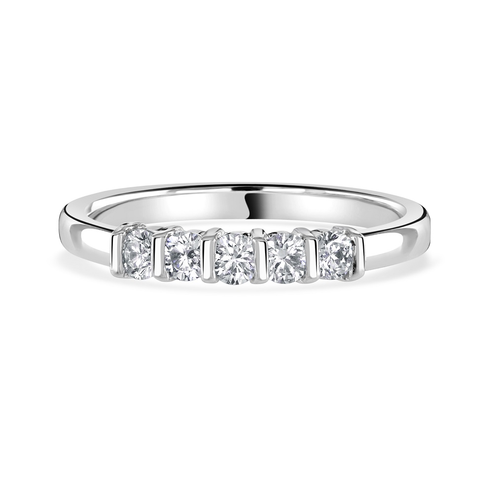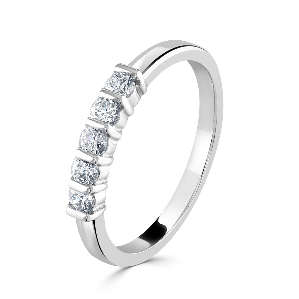 Experience the epitome of elegance with our platinum eternity ring, meticulously crafted to showcase five bar-set round brilliant cut diamonds. This ring features a total diamond weight of 0.37ct, each diamond chosen for its exceptional clarity and luminous sparkle, set against the backdrop of lustrous platinum for a truly sophisticated look.
