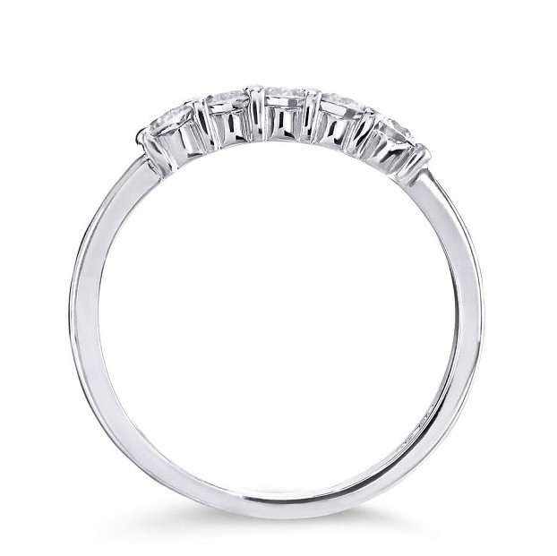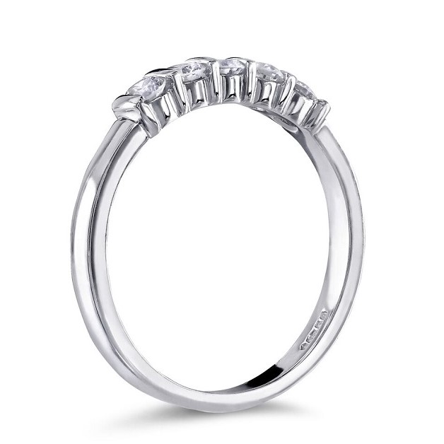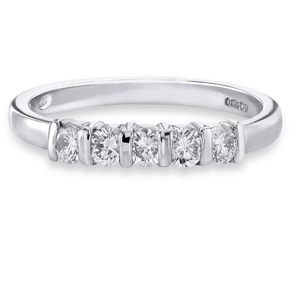 Our platinum eternity ring is a stunning embodiment of elegance and timeless sophistication. This exquisite ring is bar-set with five round brilliant-cut diamonds, totalling 0.59 carats, each chosen for their exceptional clarity and radiant sparkle.