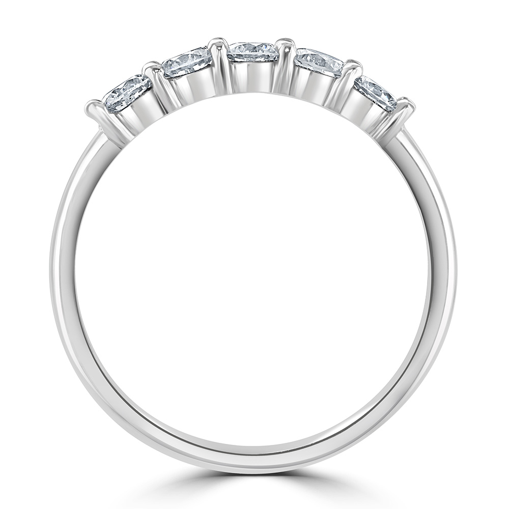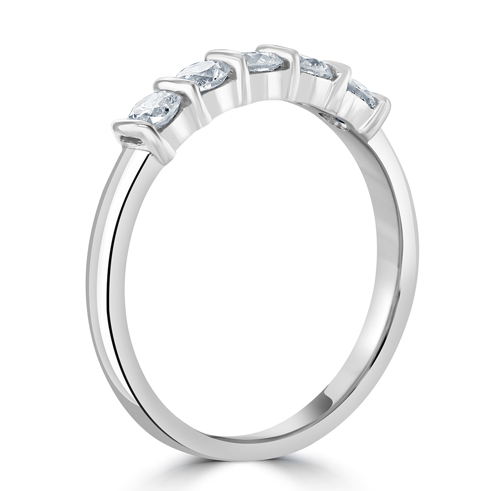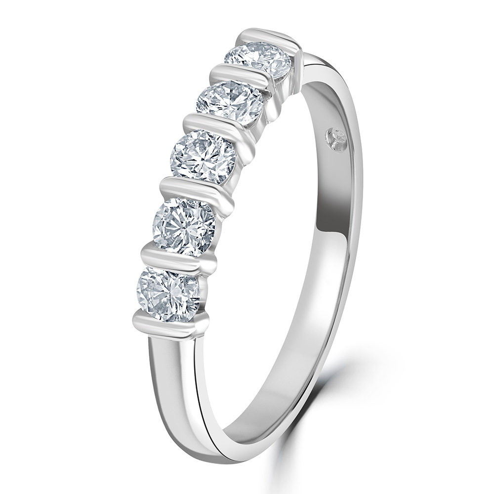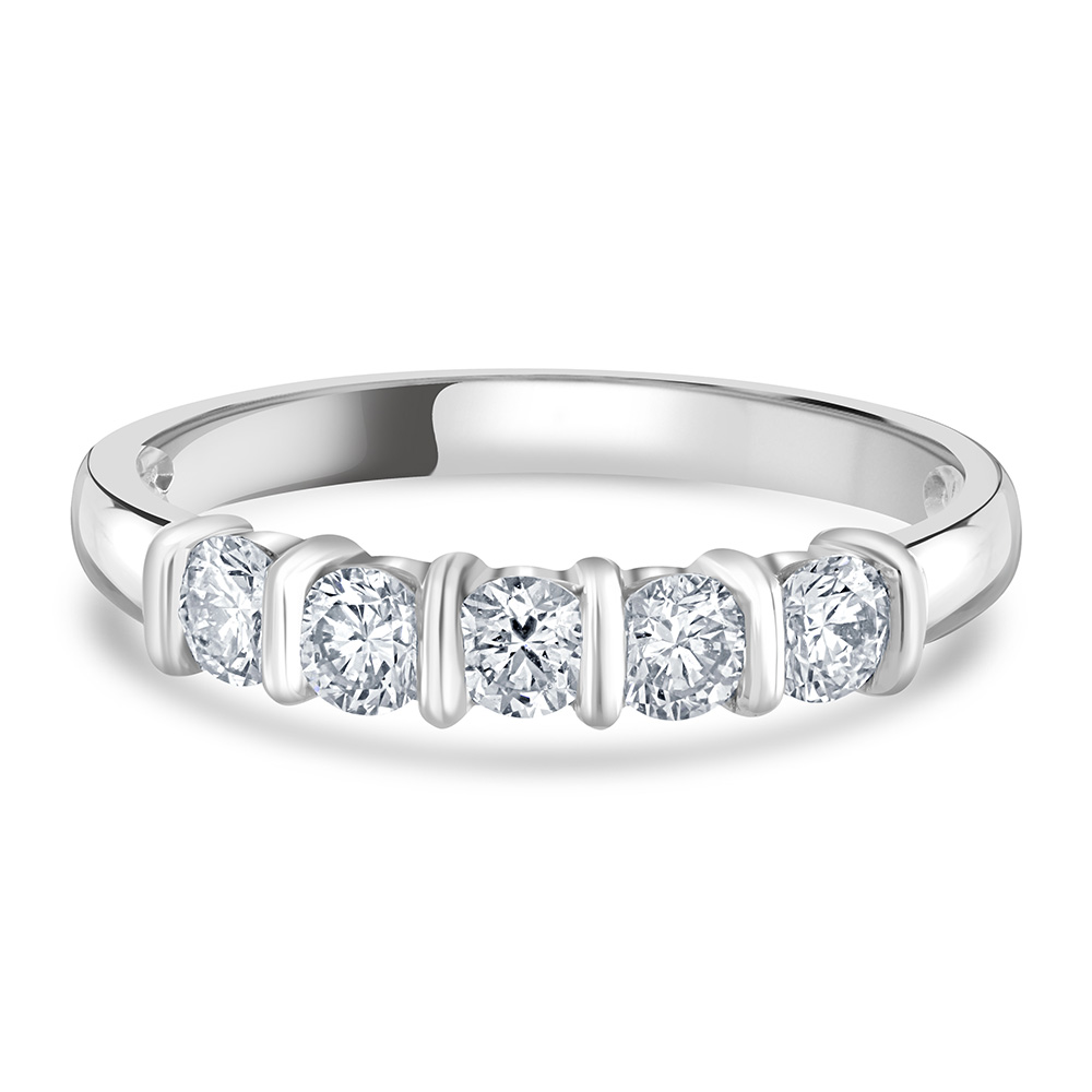 Our elegant platinum eternity ring is meticulously crafted to showcase the sheer brilliance of its design. This sophisticated ring features five round brilliant cut diamonds, each securely bar-set for a modern, sleek look. With a total diamond weight of 0.60 carats, these diamonds are selected for their clarity and sparkle, offering a continuous shimmer that captivates from every angle. Perfect for celebrating life's most significant moments or as a luxurious everyday accessory, this platinum ring embodies timeless craftsmanship and style. Add this dazzling piece to your collection and enjoy the epitome of fine jewellery design.