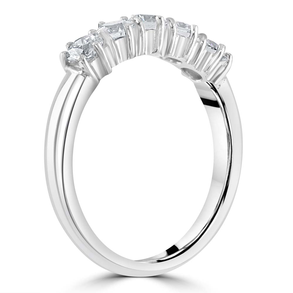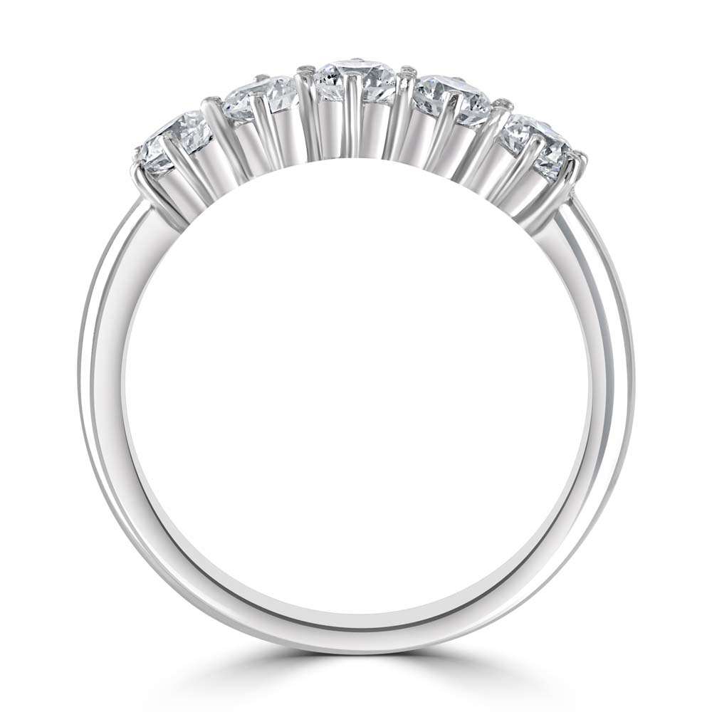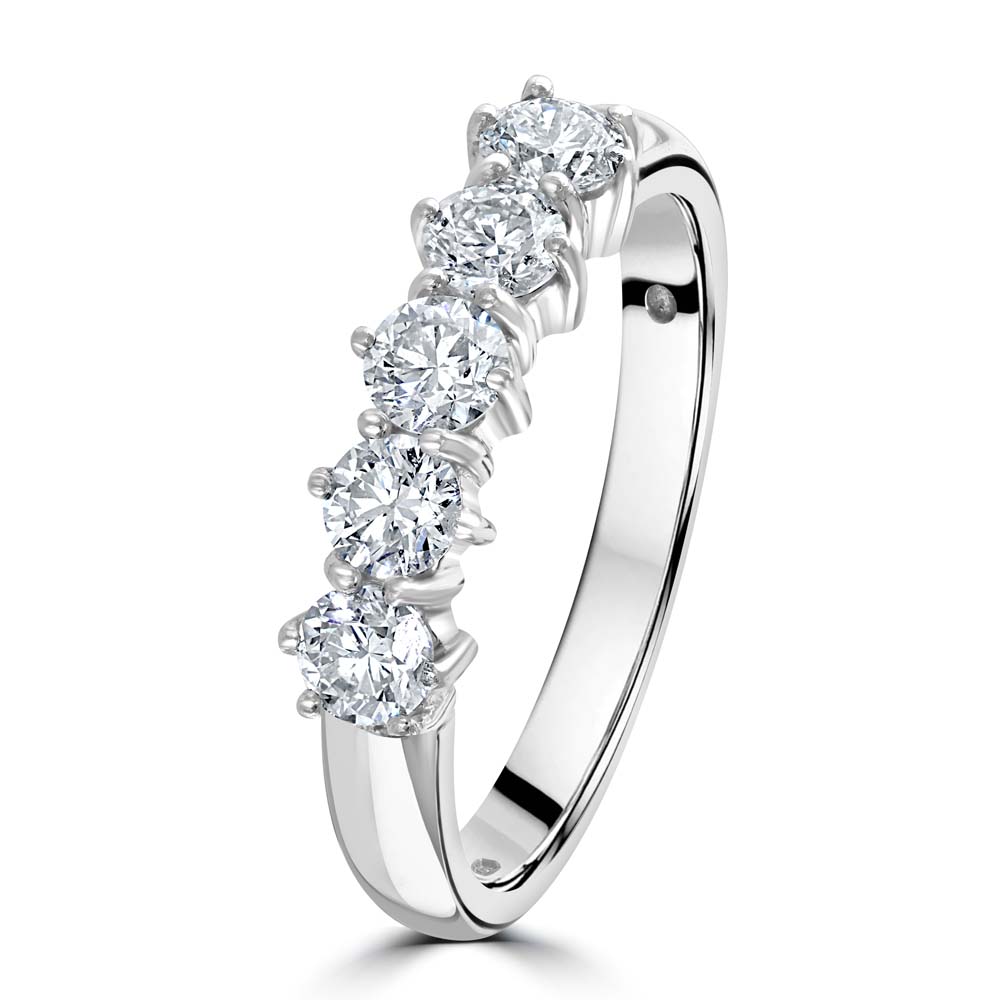 A sparkling platinum half eternity ring, a symbol of everlasting love, meticulously crafted with six claw settings that cradle five stunning round brilliant cut diamonds. This elegant piece boasts a total diamond weight of 0.81ct, each diamond hand-selected for its exceptional sparkle and clarity, promising a lifetime of brilliance and beauty. The platinum band, known for its strength and purity, ensures that this ring is not only a testament to timeless elegance but also a durable treasure that will last through the ages.