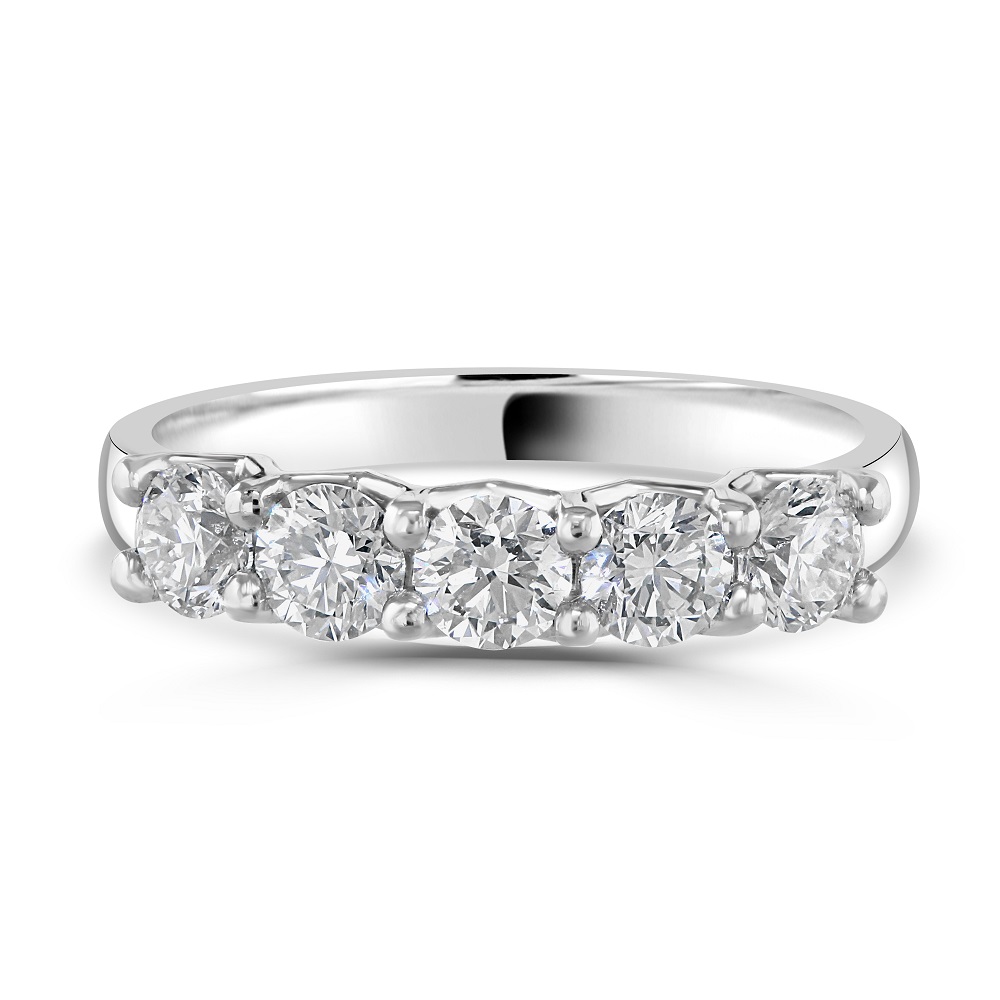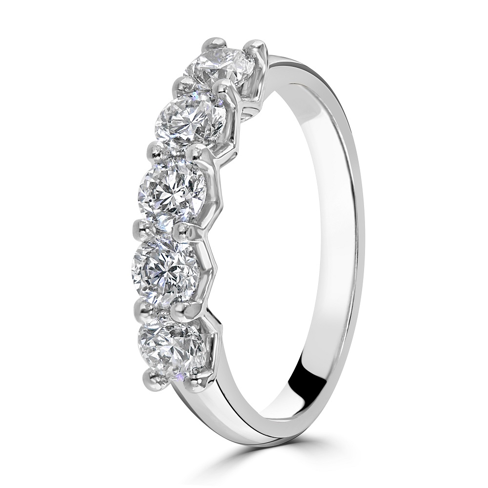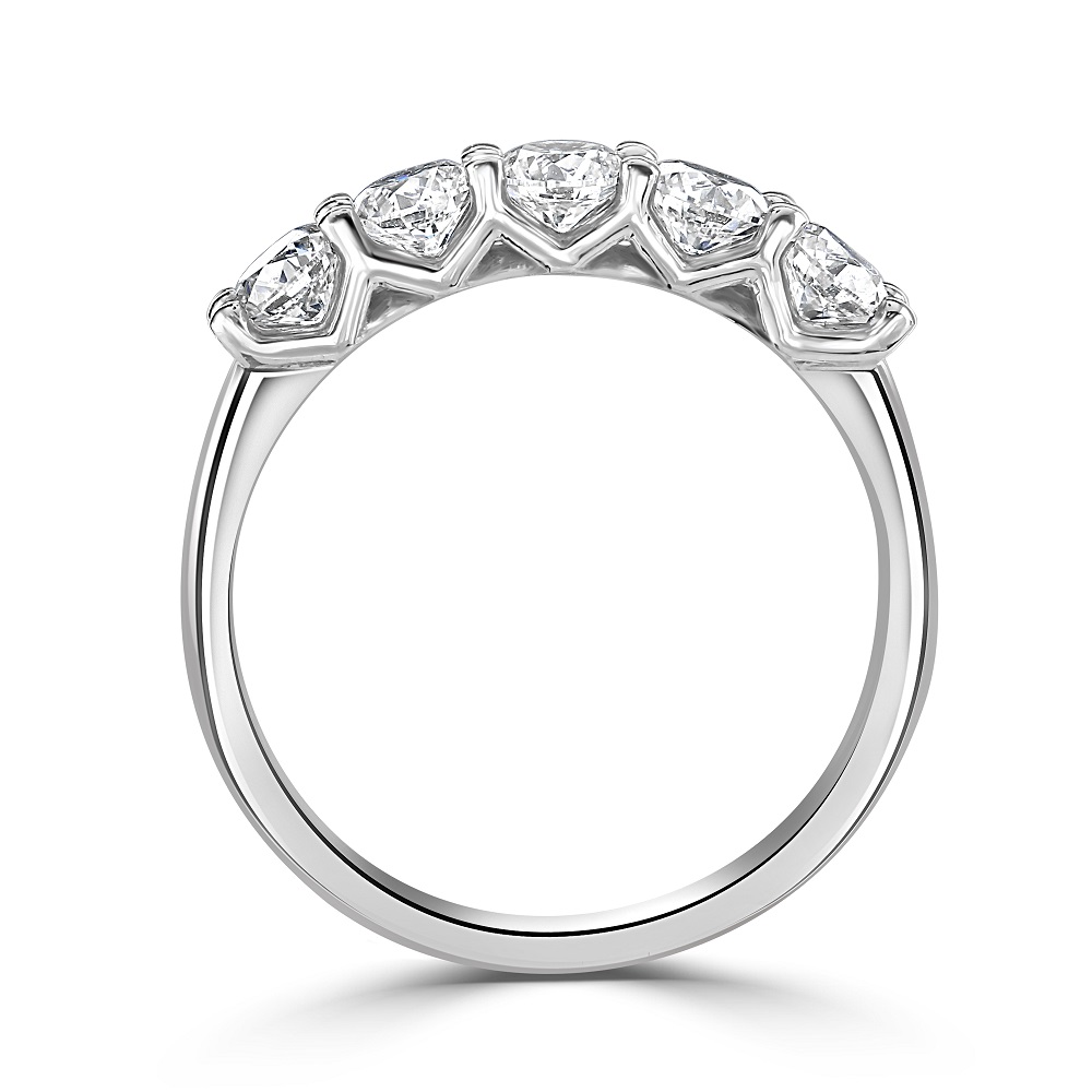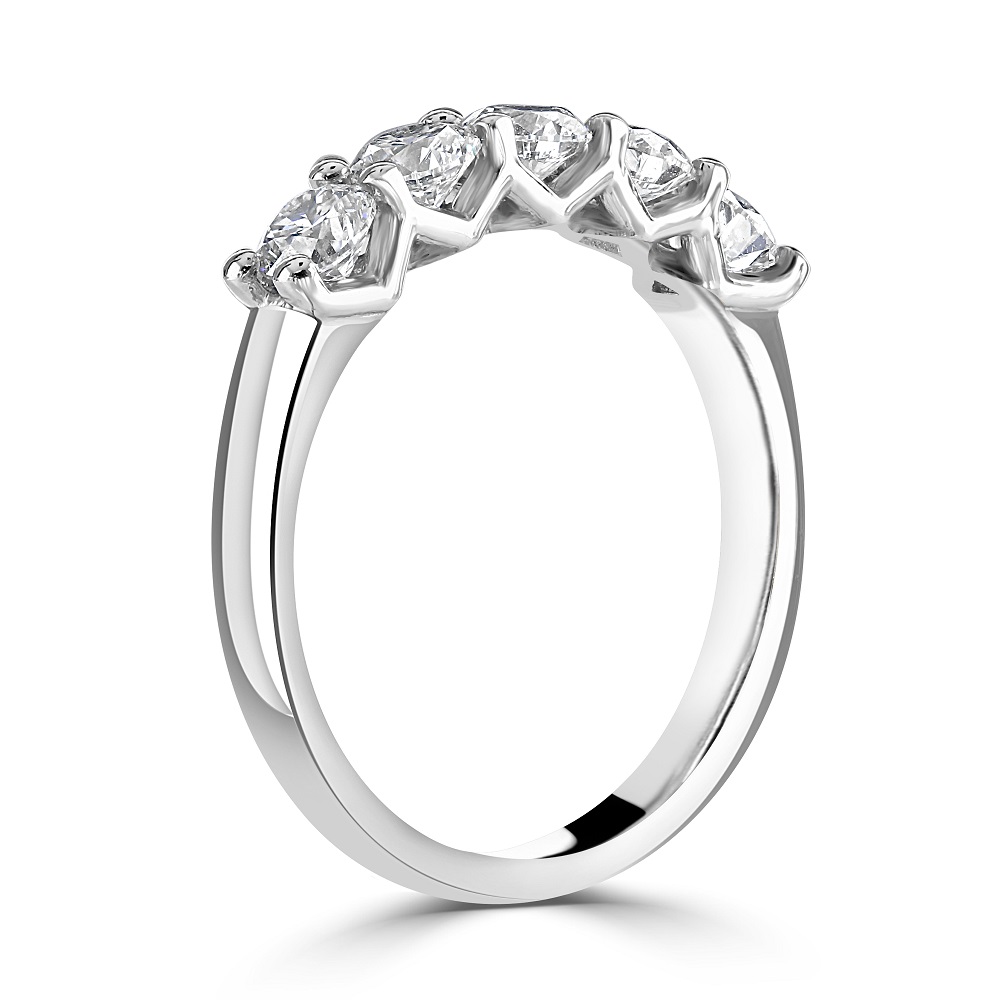 A sparkling platinum eternity ring set with five round brilliant cut diamonds. Like many of our rings this piece has been hand finished and set in in the UK. Other sizes and variations are available, please contact the store for more information.