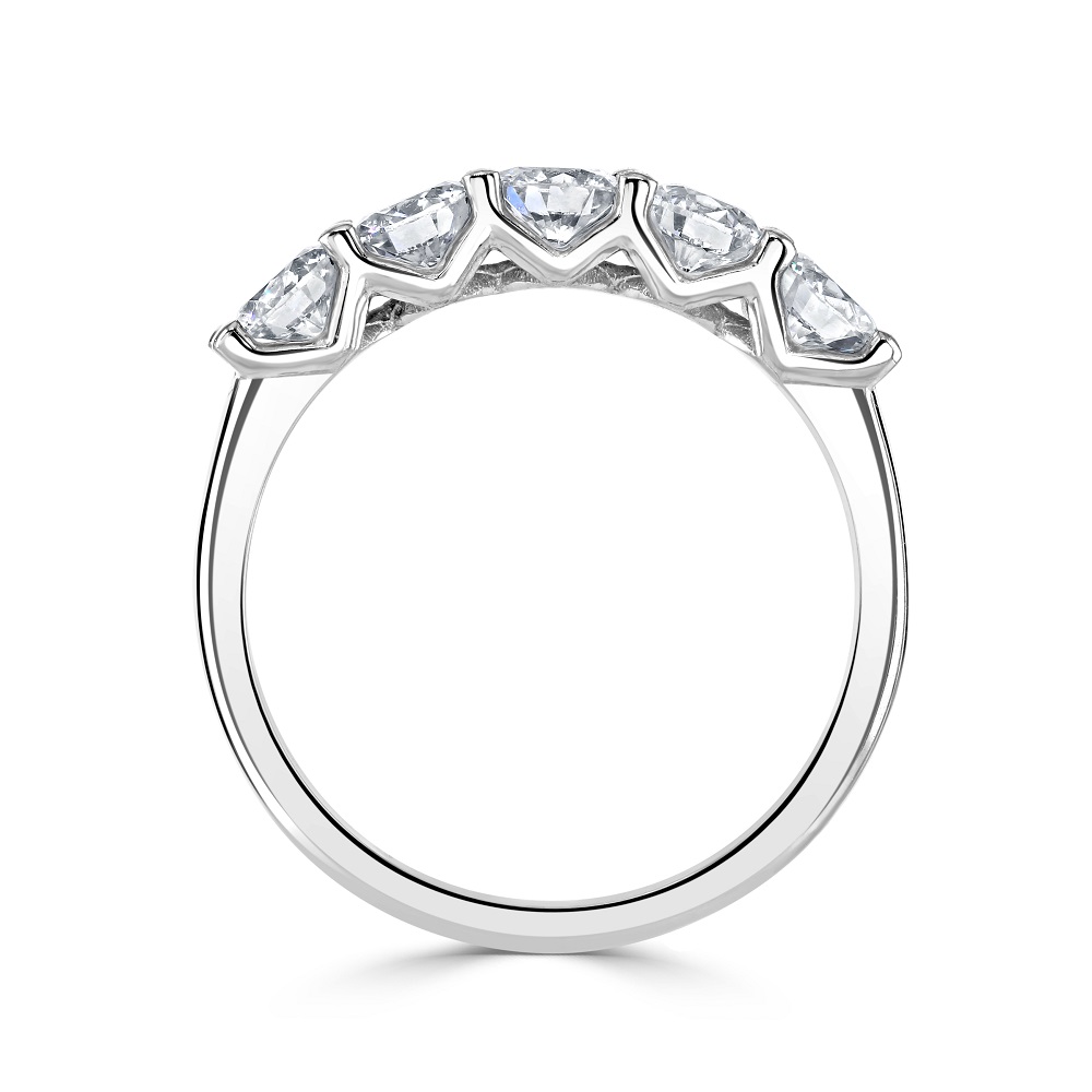 Discover the exquisite elegance of our platinum half eternity ring, featuring five stunning round brilliant cut diamonds, each securely set in a four-claw V collet setting. This luxurious ring is designed to symbolize everlasting love and commitment, making it the perfect choice for anniversaries, milestones, or any special occasion. The total diamond weight of this remarkable ring is 1.29 carats, ensuring a dazzling display of brilliance and fire. Each diamond is carefully selected for its exceptional quality, with the four-claw V collet setting allowing maximum light to pass through, enhancing their natural sparkle and radiance. Crafted from premium platinum, this half eternity ring combines timeless beauty with enduring durability. The sleek and sophisticated design ensures a comfortable fit while highlighting the brilliance of the diamonds. Ideal for those who appreciate refined elegance and superior craftsmanship, this platinum half eternity ring is a true symbol of everlasting love and sophistication.