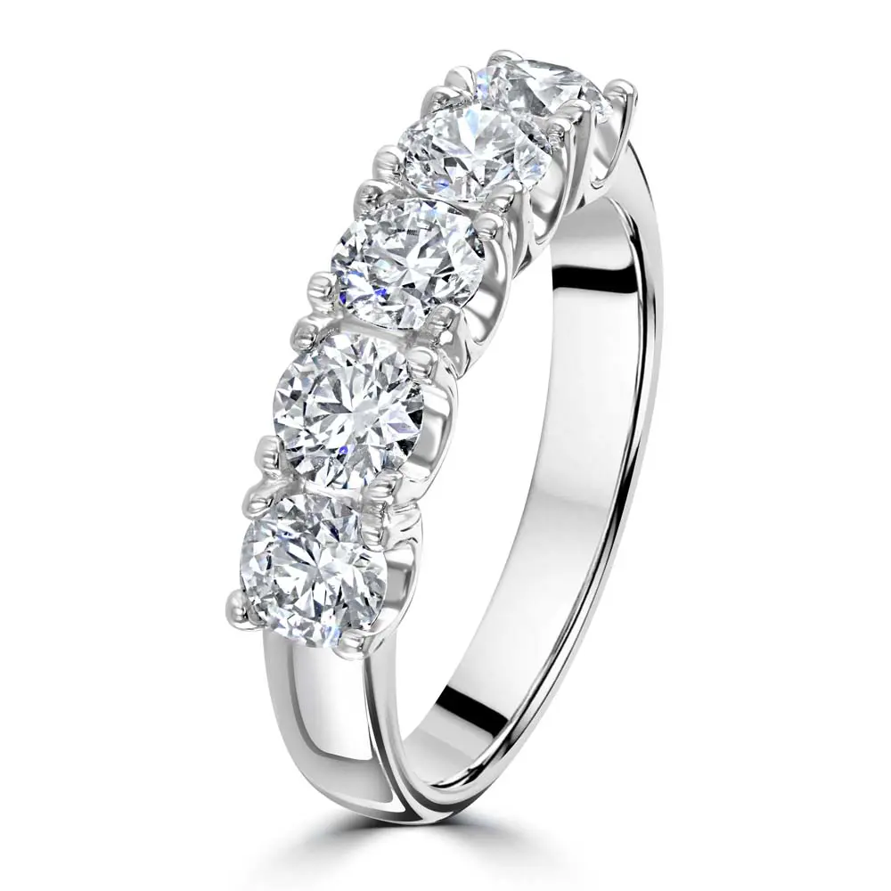 A timeless celebration of brilliance and balance, this exquisite five-stone ring is crafted in pure platinum and showcases five round brilliant cut diamonds, each meticulously set in classic four-claw settings. With each diamond weighing 0.30ct, the total carat weight of 1.50ct offers a radiant display of symmetry and sparkle. Graded E for colour and VS2 for clarity, these exceptional diamonds reflect superior quality and craftsmanship, making this ring a perfect expression of enduring elegance. The sleek platinum band enhances the luminosity of each stone, creating a refined silhouette that transitions effortlessly from day to evening. Ideal for marking a milestone or celebrating a lasting bond, this five-stone ring is a sophisticated statement of love and luxury.
