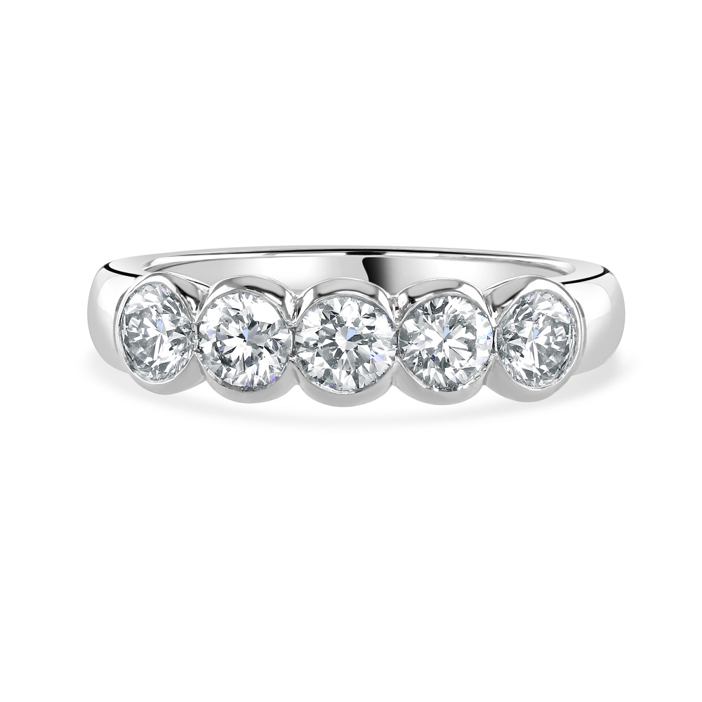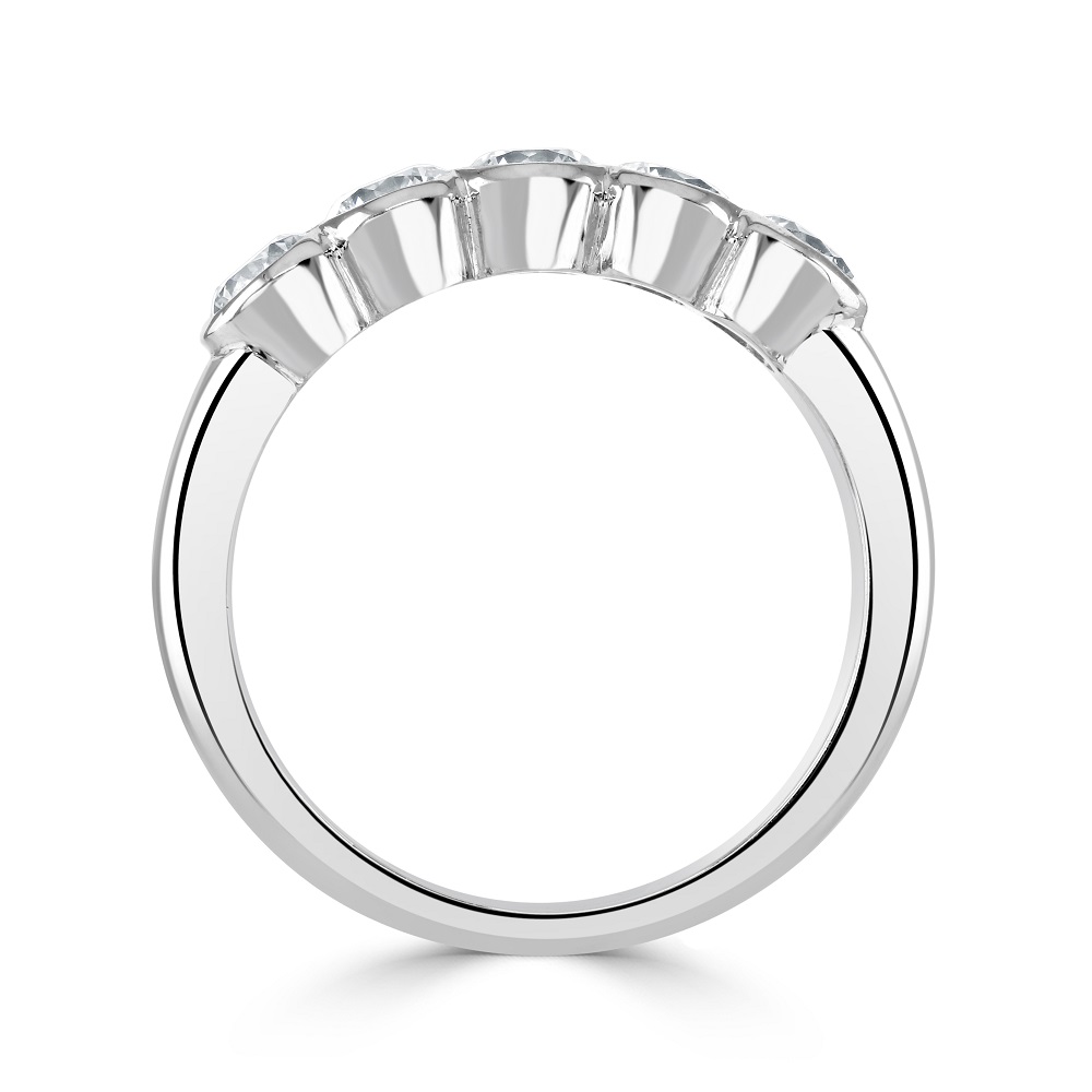 A sophisticated platinum eternity ring, featuring five round brilliant cut diamonds meticulously rubover set for a sleek, contemporary finish. With a total diamond weight of 1.03 carats, each diamond is masterfully chosen for its clarity and radiant brilliance, reflecting light magnificently to create an eye-catching sparkle. This platinum ring combines durability with a luxurious polish, making it an ideal choice for everyday wear as well as for special occasions. The rubover setting not only secures the diamonds but also provides a smooth, modern look that complements any outfit. Perfect as an anniversary gift, wedding band, or a significant token of love, this eternity ring signifies a timeless bond with elegance and style. Its classic design and exceptional craftsmanship ensure it will be a cherished piece in any jewellery enthusiast’s collection. Indulge in the lasting beauty of this platinum diamond eternity ring, where luxury meets lasting durability.
