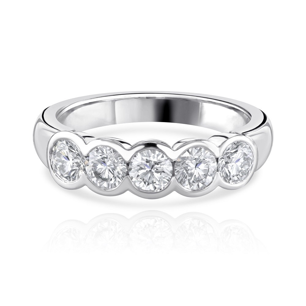 Experience our sophisticated platinum five diamond eternity ring, a luxurious symbol of everlasting love. This ring features five round brilliant cut diamonds, each securely rubover set, totalling 1.02 carats. The rubover setting not only protects each diamond but also enhances its natural brilliance, allowing the light to reflect beautifully across the stones. Crafted from premium platinum, this ring boasts exceptional durability and a timeless, sleek design that makes it a perfect choice for an anniversary, wedding band, or a special celebratory gift. Embrace this stunning piece of fine jewellery that promises to add a touch of elegance and everlasting sparkle to your collection.