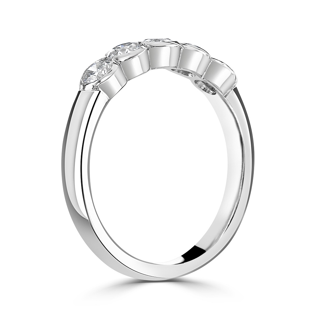 Experience the timeless elegance of our platinum ring, beautifully showcasing five round brilliant cut diamonds with a total weight of 0.72 carats. Each diamond is expertly rubover set, creating a sleek and modern profile that enhances the stones' natural brilliance and fire. The secure setting ensures each diamond is protected while providing a smooth finish that's comfortable for everyday wear. Crafted from premium platinum, this ring combines durability with a refined aesthetic, making it perfect for those who appreciate sophisticated, minimalist jewellery. Ideal for special occasions or as a luxurious everyday accessory, this diamond ring offers both glamour and elegance to any ensemble.