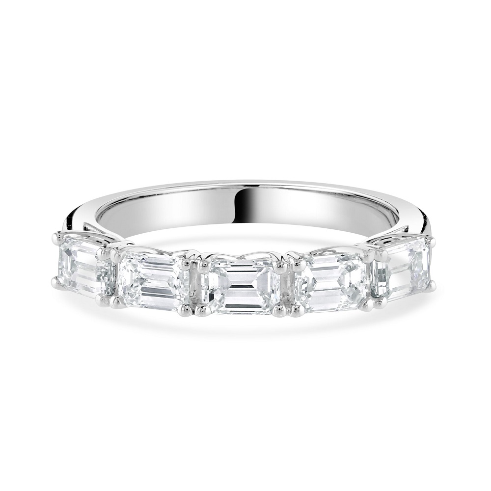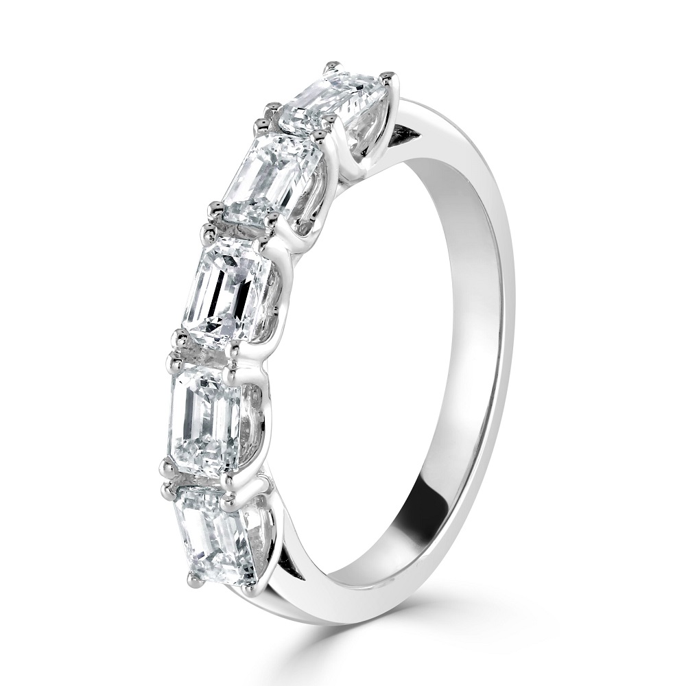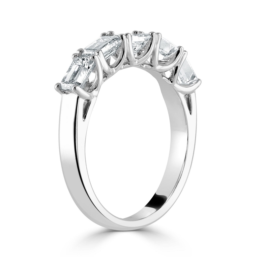 A sophisticated platinum emerald cut diamond ring that exudes timeless elegance and unparalleled luxury. This exquisite ring features five emerald cut diamonds, each meticulously four-claw set across the finger, presenting a breathtaking display of clarity, cut, and luminous brilliance. With a total diamond weight of 1.52ct, these diamonds have been carefully selected for their exceptional quality and captivating sparkle, ensuring a stunning visual impact from every angle.