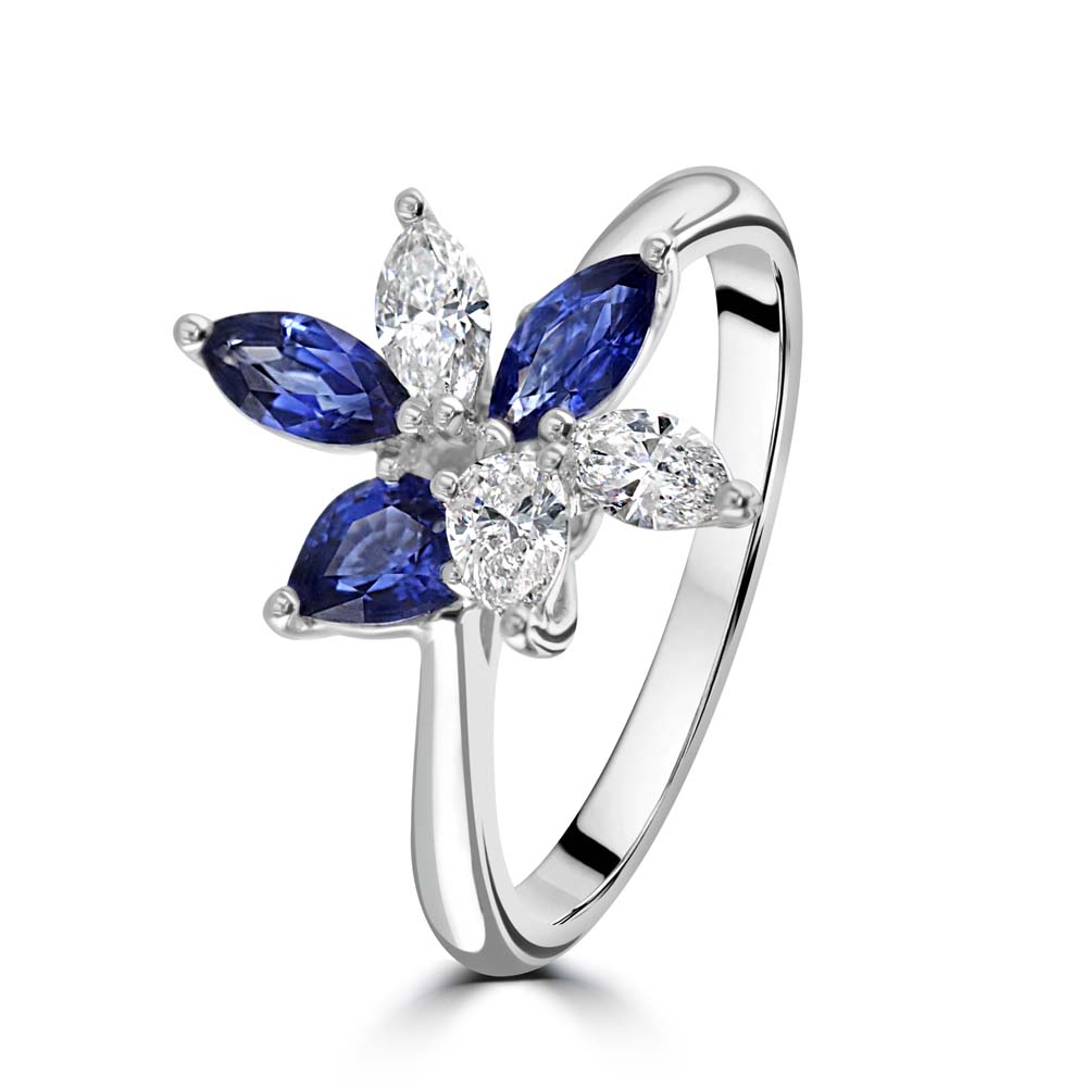 Our exquisite platinum ring has been meticulously designed to captivate and enchant. This stunning piece features a harmonious blend of precious gemstones, including 2 marquise cut sapphires, 2 marquise cut diamonds, 1 pear cut sapphire, and 1 pear cut diamond, all securely claw set to enhance their natural brilliance. The sapphires, with a total weight of 0.92ct, exude a deep, mesmerizing blue, symbolizing wisdom and royalty. Complementing them are the diamonds, totalling 0.47ct, which add a dazzling sparkle and timeless elegance to the ring. Each gemstone is carefully selected and expertly set to create a perfect balance of colour and light. Ideal for marking significant milestones or as a cherished gift for a loved one, it embodies both beauty and sentiment. The durable platinum setting ensures that this ring will be a treasured heirloom for generations to come.