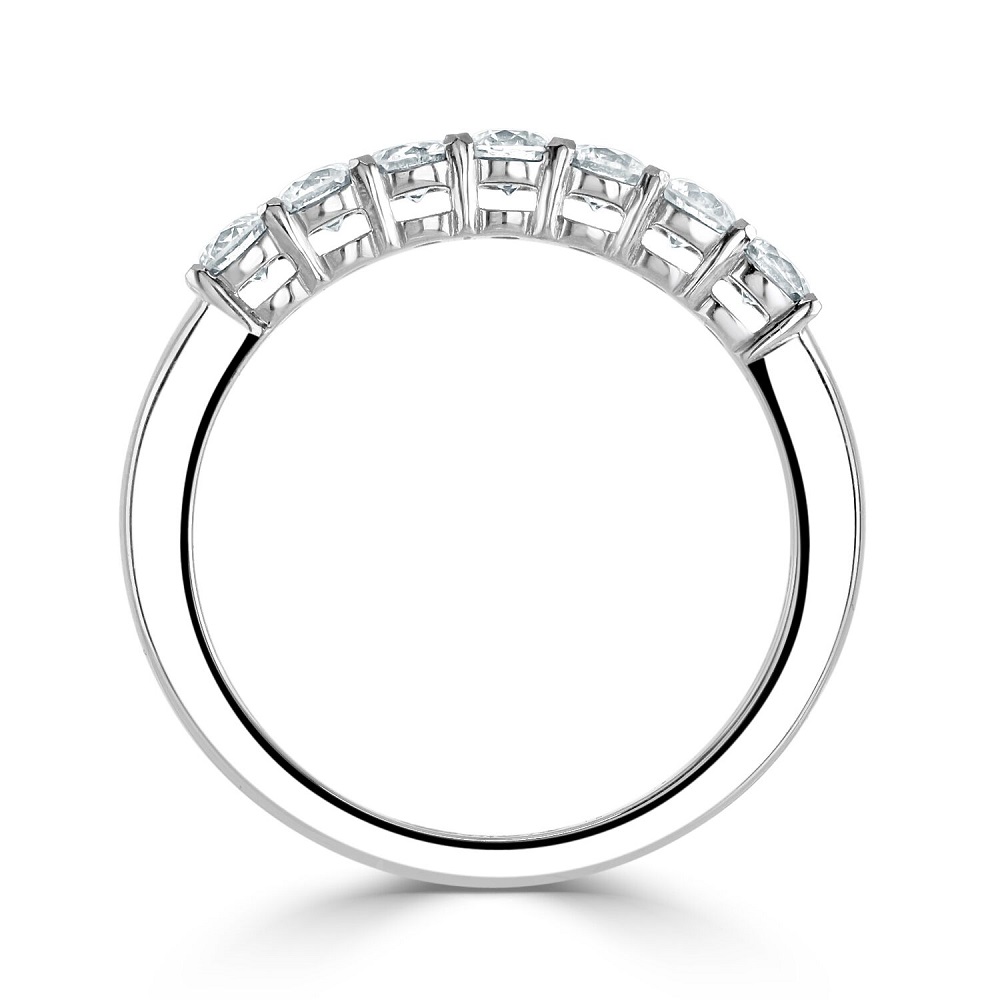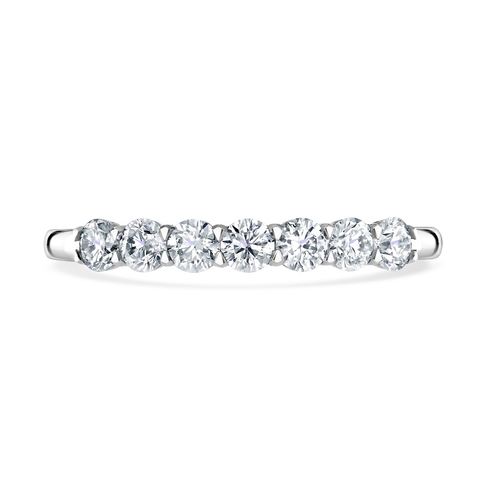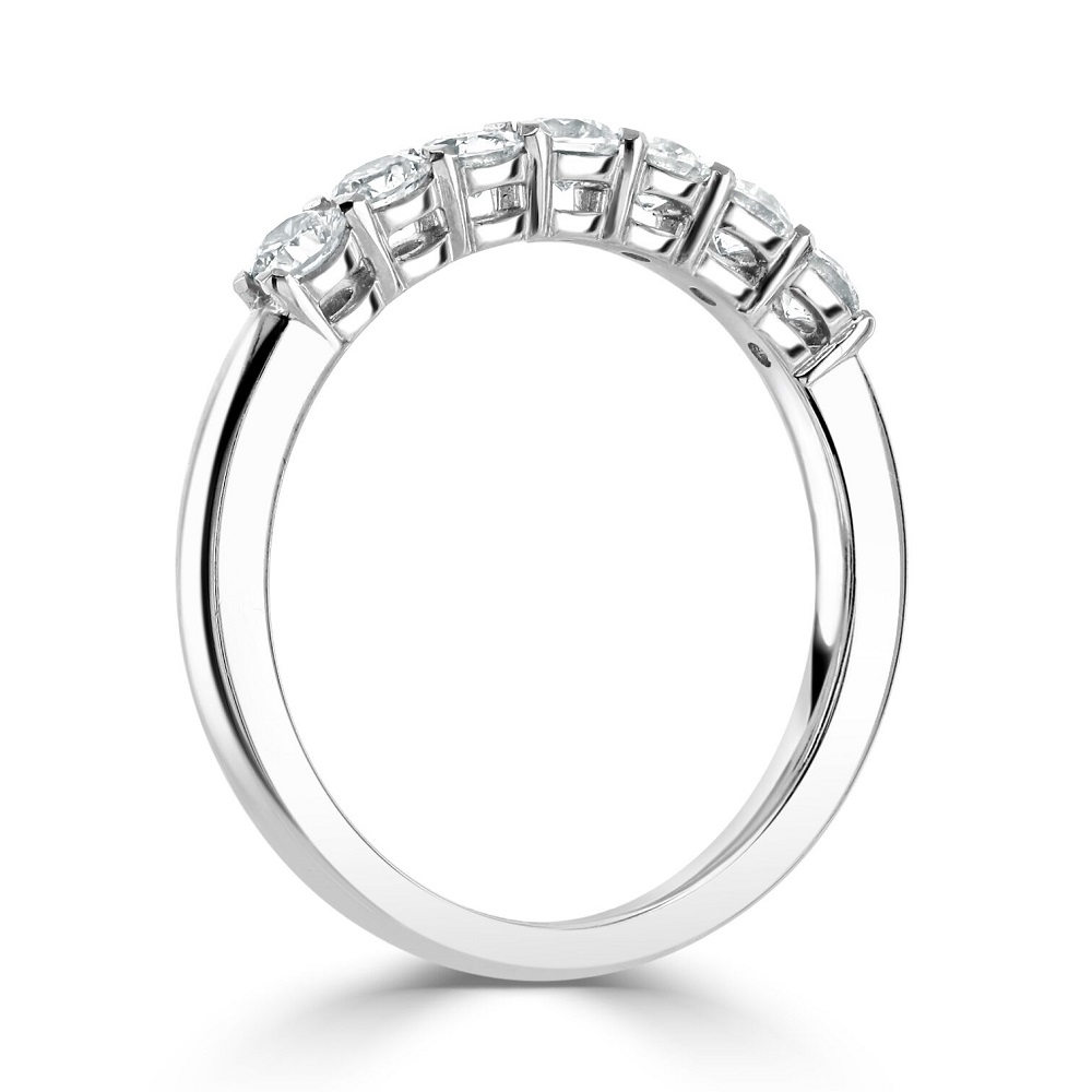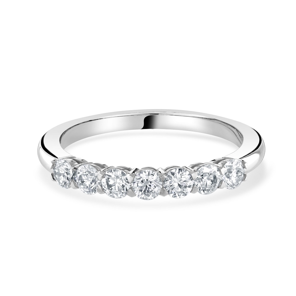 Our timeless platinum eternity ring is an exquisite symbol of everlasting love. This luxurious ring features seven round brilliant cut diamonds, each meticulously set in a four-claw setting to ensure maximum exposure and brilliance. The total diamond weight of 0.56 carats radiates exceptional sparkle and clarity, making this ring a stunning choice for celebrating life's most cherished moments. Crafted from high-quality platinum, known for its strength and durability, this ring offers both beauty and longevity. Perfect as a wedding band, anniversary gift, or a special token of affection, our platinum eternity ring is designed to be a lasting reminder of your enduring commitment and love.