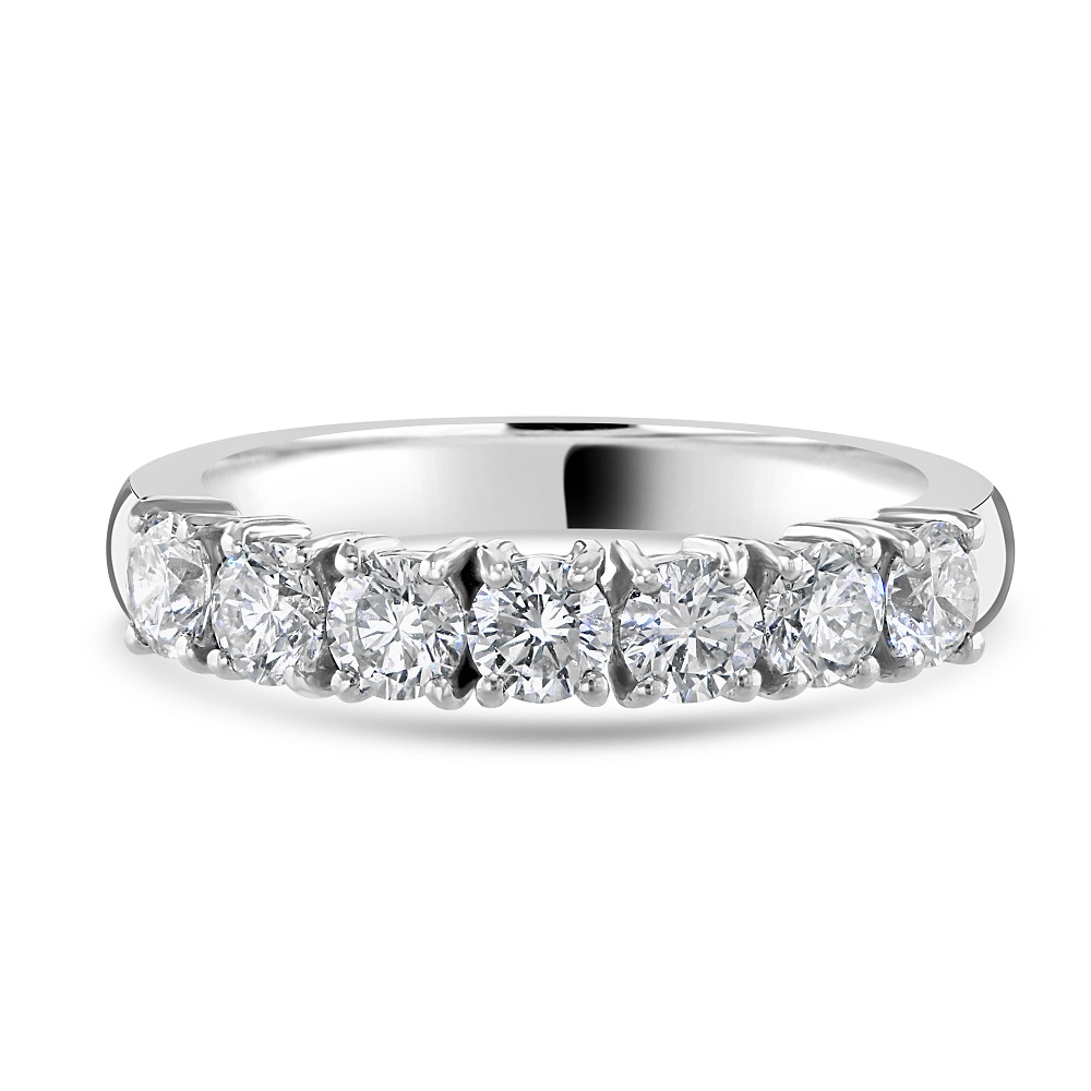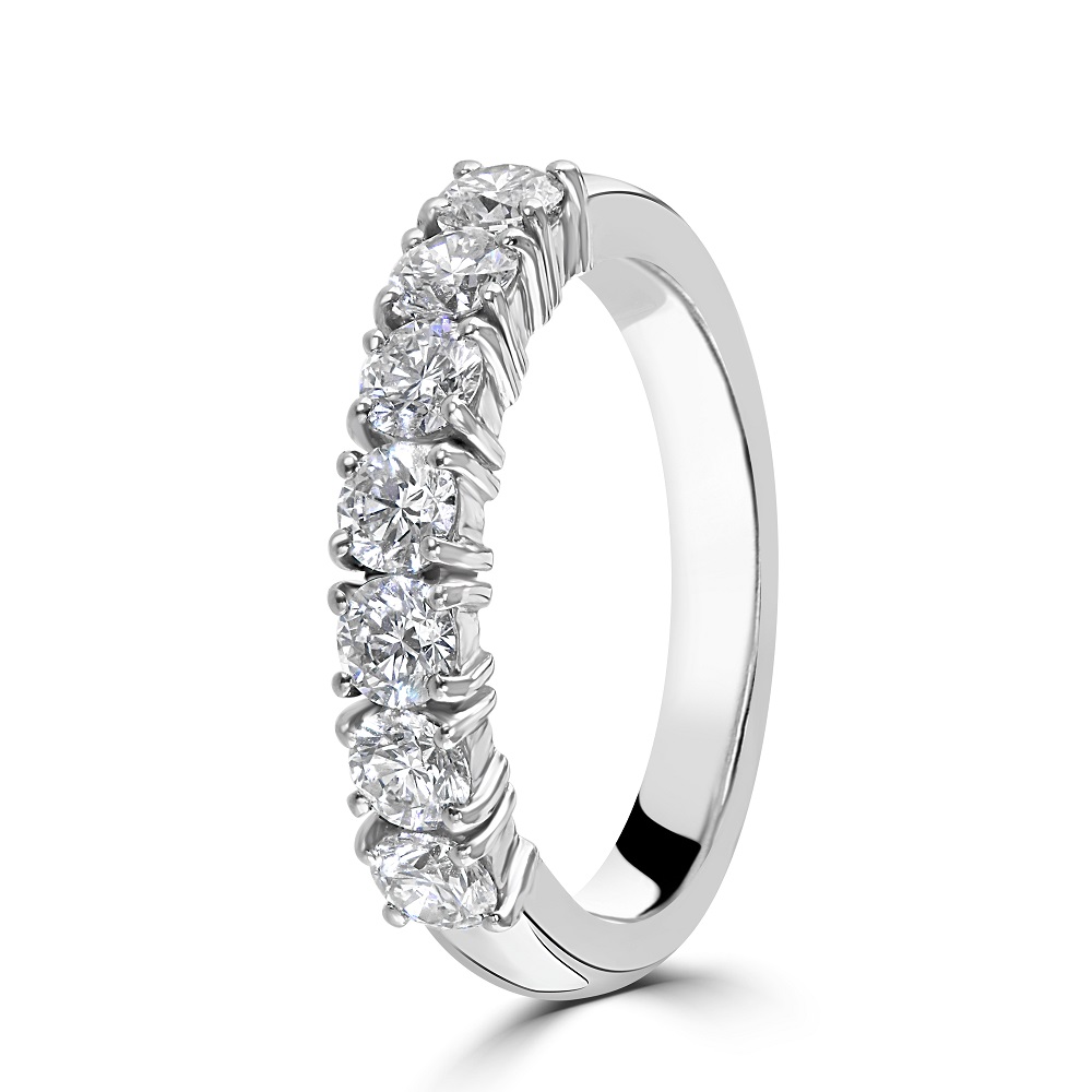 Enhance your fine jewellery collection with our platinum eternity ring, a symbol of everlasting love and elegance. This luxurious ring features seven round brilliant cut diamonds, collectively weighing 1.03 carats, each meticulously set in a four-claw arrangement that maximizes their visibility and brilliance. Crafted from premium platinum, known for its durability and hypoallergenic properties, this ring combines timeless style with exceptional strength. Ideal for celebrating significant anniversaries or as a sophisticated wedding band, this half eternity ring promises enduring beauty and an everlasting sparkle that complements any ensemble.