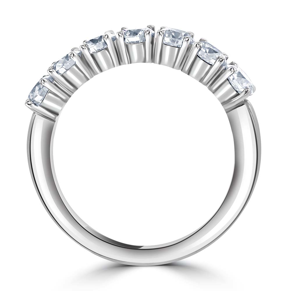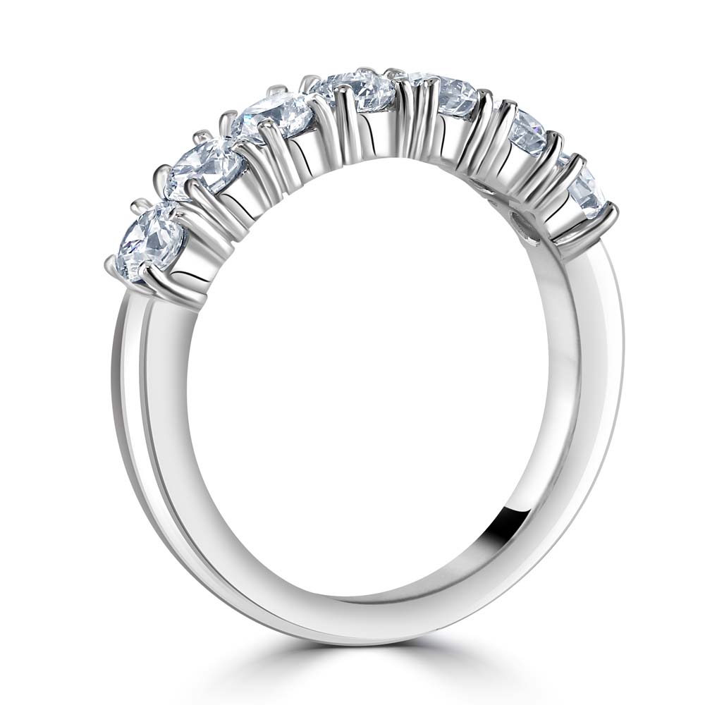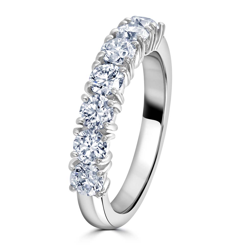 An elegant platinum eternity ring, exquisitely crafted with seven round brilliant cut diamonds, each securely held in a classic four-claw setting. The diamonds collectively boast a total weight of 1.35 carats, creating a radiant band of light that encapsulates sophistication and luxury. Crafted from premium platinum, known for its strength and purity, this ring offers both durability and a sleek, timeless finish. The setting allows each diamond to catch the light perfectly, enhancing their natural brilliance and ensuring a stunning sparkle from every angle. Ideal for celebrating life's most cherished moments, this eternity ring is perfect as an anniversary gift, wedding band, or a luxurious token of affection. It represents a commitment to everlasting beauty and quality, making it a treasured addition to any fine jewellery collection. Elevate your ensemble with this magnificent platinum diamond ring, where classic design meets contemporary allure.
