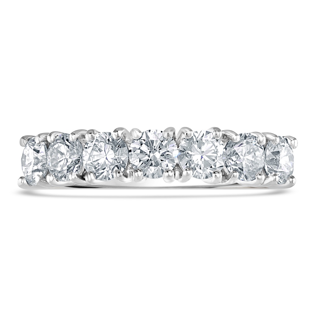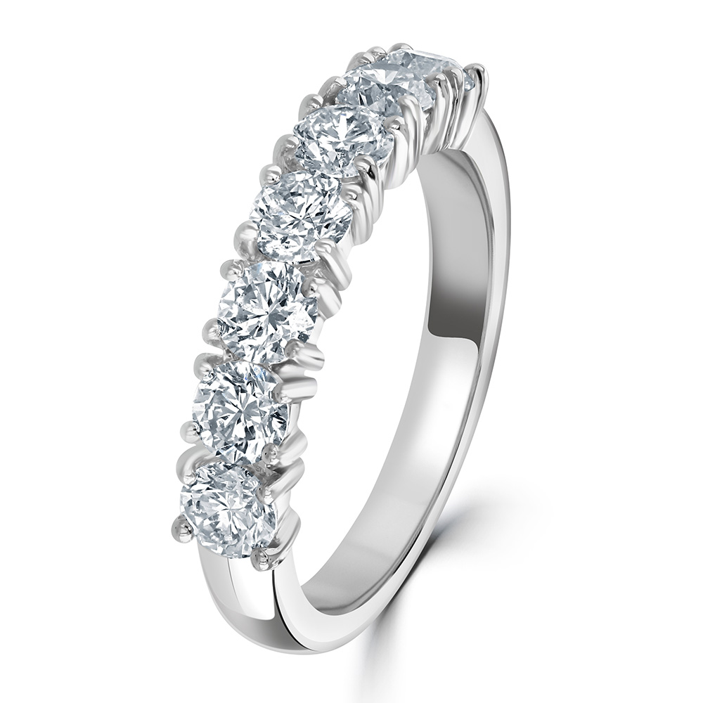 Discover timeless elegance with our platinum half eternity ring, expertly crafted to showcase a stunning array of seven round brilliant cut diamonds, totalling 1.35 carats. Each diamond is securely held by a four-claw wire setting, designed to maximize light exposure and enhance the stones' inherent brilliance and sparkle. Crafted from premium platinum, this ring offers durability and a sleek, polished look that stands the test of time. Perfect for an anniversary, a special milestone, or everyday luxury, this half eternity ring embodies classic sophistication with a modern twist, making it a superb addition to any jewellery collection.