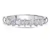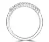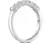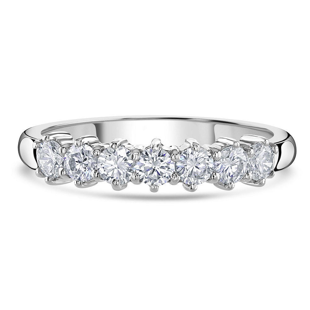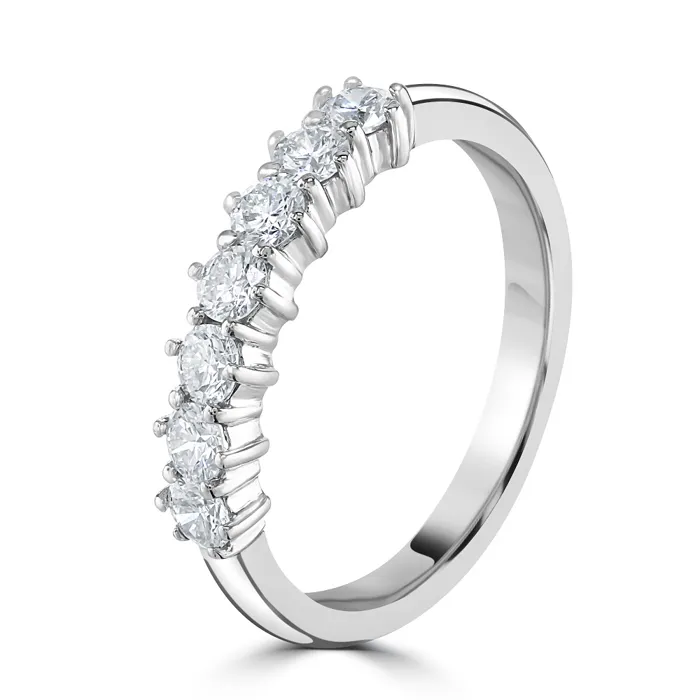 A platinum eternity ring, a symbol of everlasting love, exquisitely set with seven round brilliant-cut diamonds. Each diamond, carefully selected for its radiance, is securely held in place by six claws, enhancing both their security and aesthetic, allowing for optimal light exposure to maximize sparkle and brilliance.