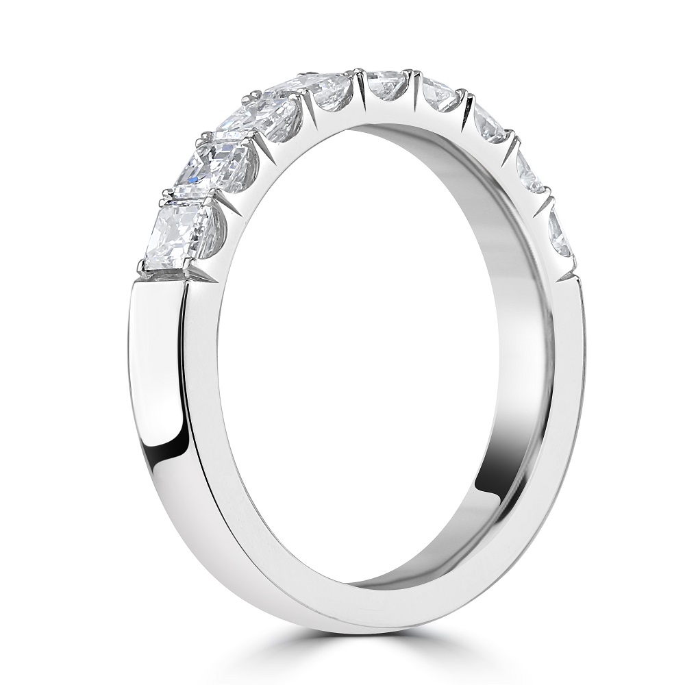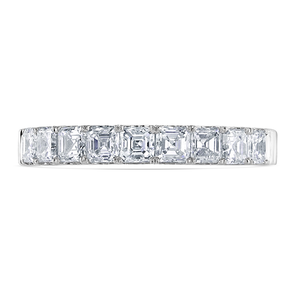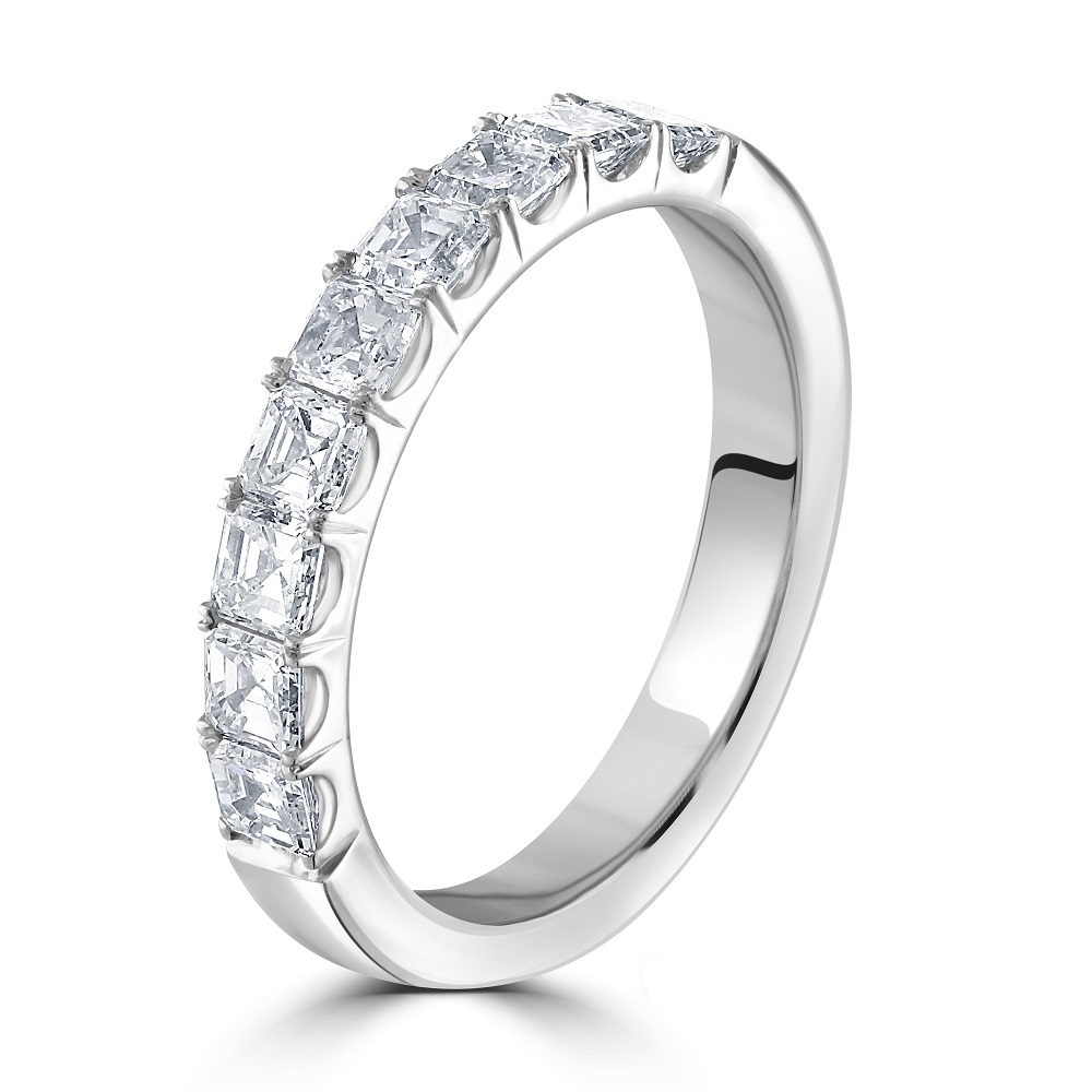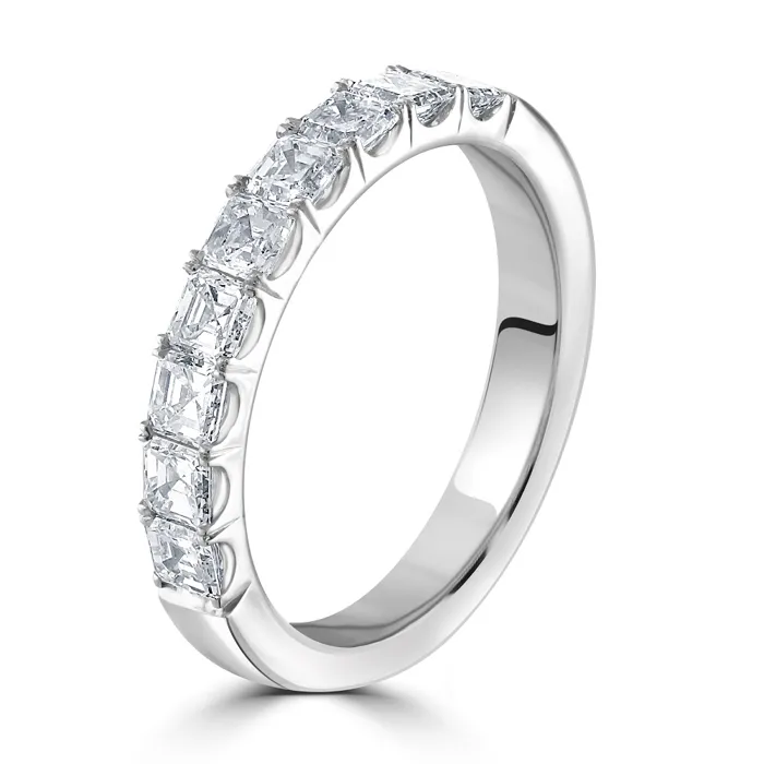 Crafted from the finest platinum, known for its durability and sleek finish, this half eternity ring offers a modern yet timeless setting that enhances the distinctive cut of the asscher diamonds. The platinum's cool sheen perfectly complements the diamonds' clarity, creating a harmonious and stunning piece that's perfect for celebrating life's most precious moments.