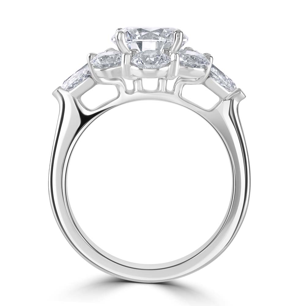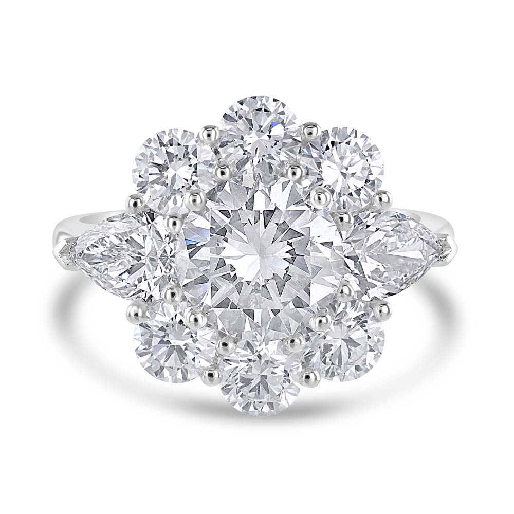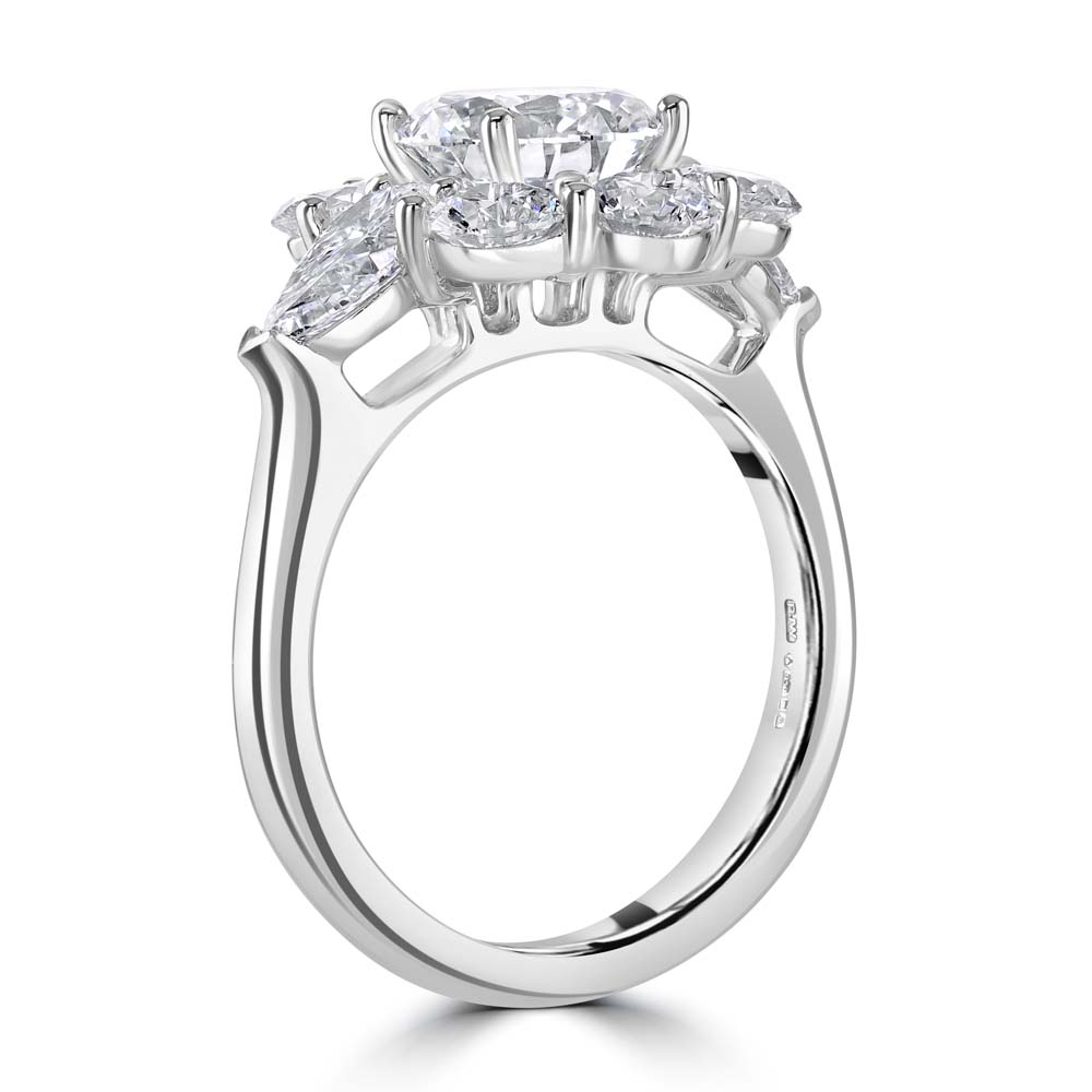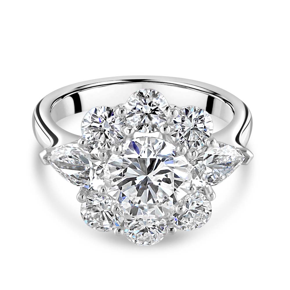 Elevate your jewellery collection with our exquisite platinum cluster ring, masterfully crafted to showcase timeless brilliance and sophistication. At its heart lies a dazzling round brilliant cut diamond, claw set to capture and reflect light from every angle. Surrounding this captivating centrepiece are six additional round brilliant cut diamonds, each meticulously claw set to form a radiant floral-inspired cluster. Enhancing the ring’s graceful silhouette, a pear cut diamond is set on each shoulder, adding a touch of refined elegance and elongating the design with their graceful taper. Crafted from premium platinum, this ring offers a luxurious and enduring setting that perfectly complements the fire and clarity of the diamonds. Ideal for those who appreciate classic beauty with a contemporary twist, this cluster ring is a stunning choice for special occasions, a meaningful gift, or a breathtaking engagement ring. Its harmonious blend of shapes and sparkle makes it a timeless treasure.