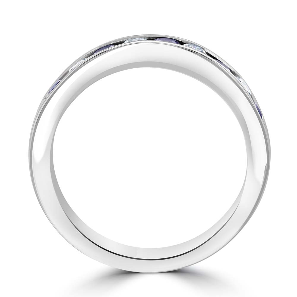An elegant platinum half eternity ring, beautifully channel-set with a mesmerizing sequence of 5 round sapphires and 4 round brilliant-cut diamonds. This exquisite piece blends the timeless allure of sapphires with the unmatched sparkle of diamonds, offering a luxurious and sophisticated accessory for any occasion. Perfect for those who appreciate the harmony of precious gemstones set in durable platinum, this ring promises lasting beauty and style. Other sizes and variations are available, please contact the store for more information.