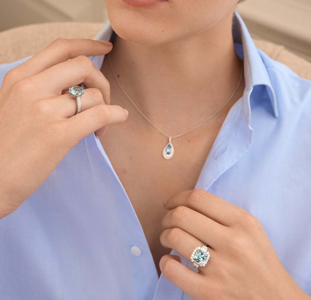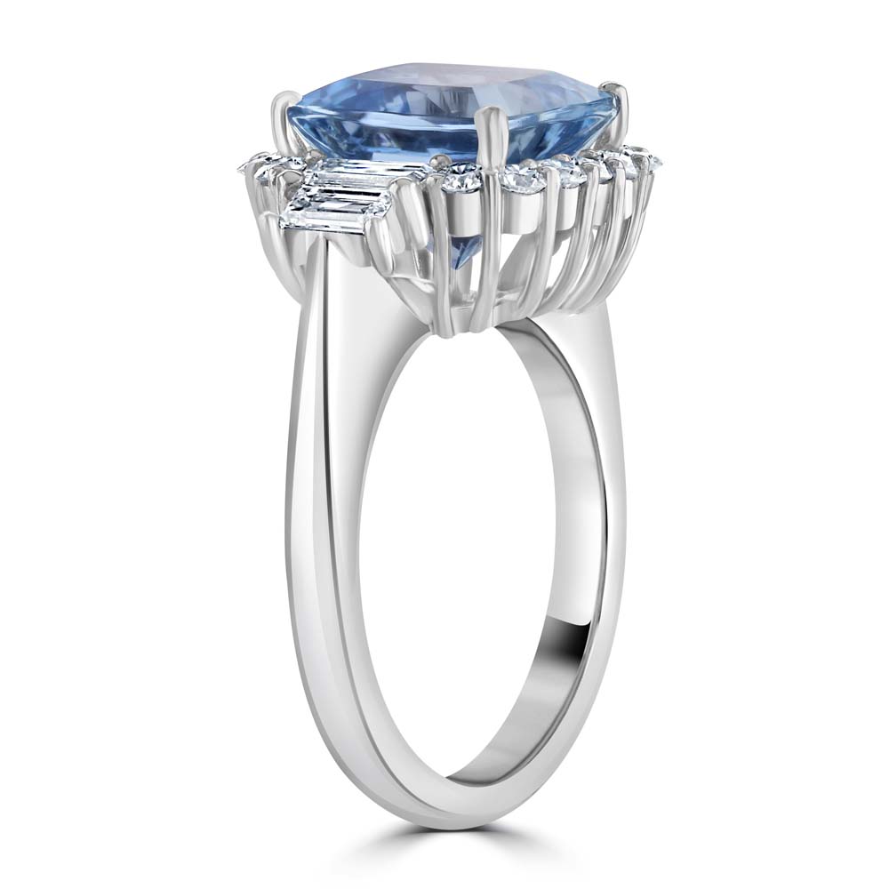 A masterpiece that embodies elegance and sophistication. At the heart of this exquisite design lies a mesmerizing cushion cut aquamarine, securely held by four claws, its serene blue hue evoking the tranquillity of the sea. This captivating centre stone is encircled by 14 round brilliant-cut diamonds, each meticulously set to create a dazzling halo that enhances the aquamarine's natural beauty and brilliance Adding to the ring's unique charm are two baguette-cut diamonds on each shoulder, claw-set to perfection. These elongated diamonds provide a sleek, modern contrast to the round stones, while their precise cut complements the central aquamarine's soft contours. Crafted in platinum, this ring stands as a symbol of durability and strength, it’s cool, silvery sheen accentuating the icy blue of the aquamarine and the sparkling clarity of the diamonds. The platinum setting ensures a timeless elegance and a luxurious feel, making this ring an ideal choice for those seeking a piece that combines classic beauty with contemporary flair.