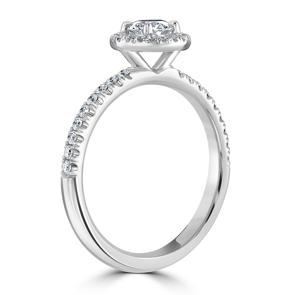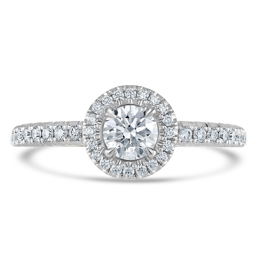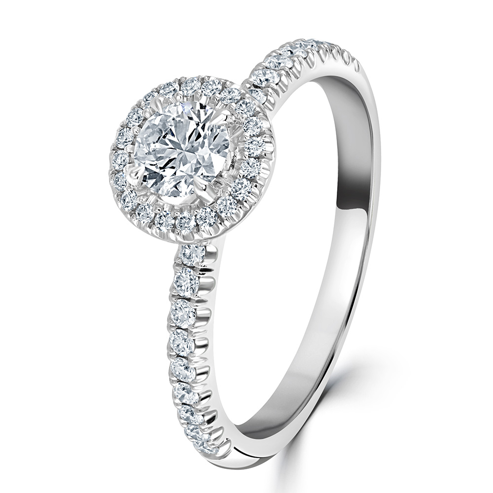 An exquisite platinum cluster ring, a beacon of luxury and sophistication. This ring features a breathtaking GIA Certified centre diamond, weighing 0.40ct, round brilliant cut and securely held by four claws. Its exceptional E colour and VS1 clarity ensure a dazzling display of light and brilliance. Encircling this central masterpiece is a halo of meticulously selected round brilliant cut diamonds, enhancing the ring's radiance and appeal.