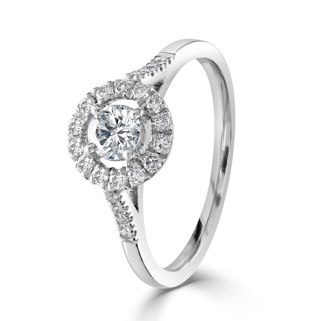 Presenting our stunning platinum halo ring, designed to captivate and charm with its exquisite detailing and luxurious craftsmanship. At the heart of this elegant ring is a 0.30ct round brilliant cut diamond, securely held in a four-claw setting, ensuring it stands out with unmatched brilliance. Encircling this central gem is a halo of micro claw set diamonds that enhance the sparkle and draw further attention to the centrepiece. The ring's shank, adorned with additional diamonds on the shoulders, adds to the overall radiance, with these supplementary stones contributing an additional 0.26ct to the total diamond weight. Crafted in sleek platinum, this halo ring combines durability with a sophisticated aesthetic, making it an ideal choice for engagements, anniversaries, or as a significant gift to celebrate a special moment.