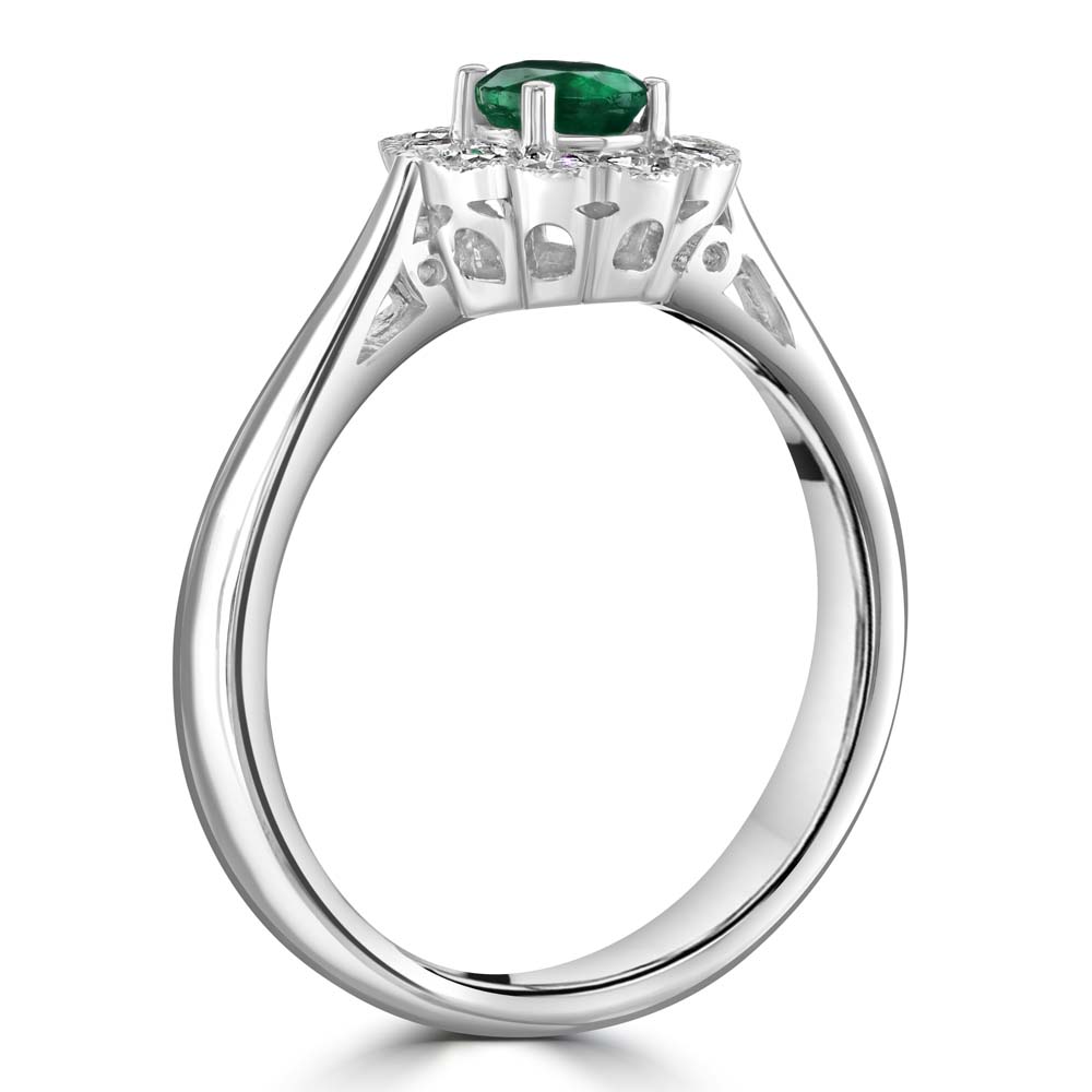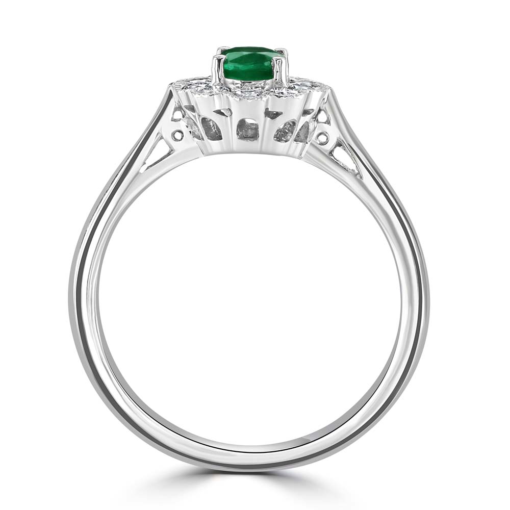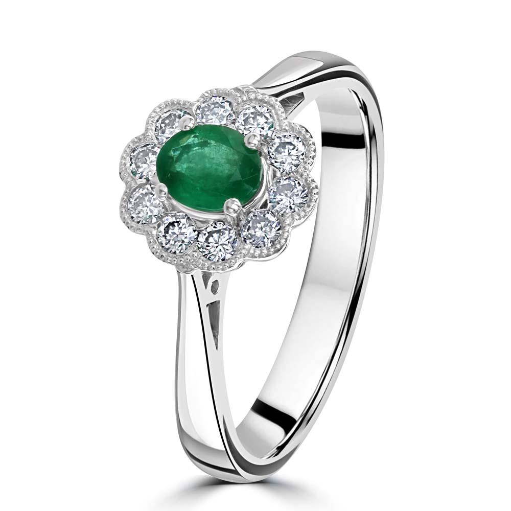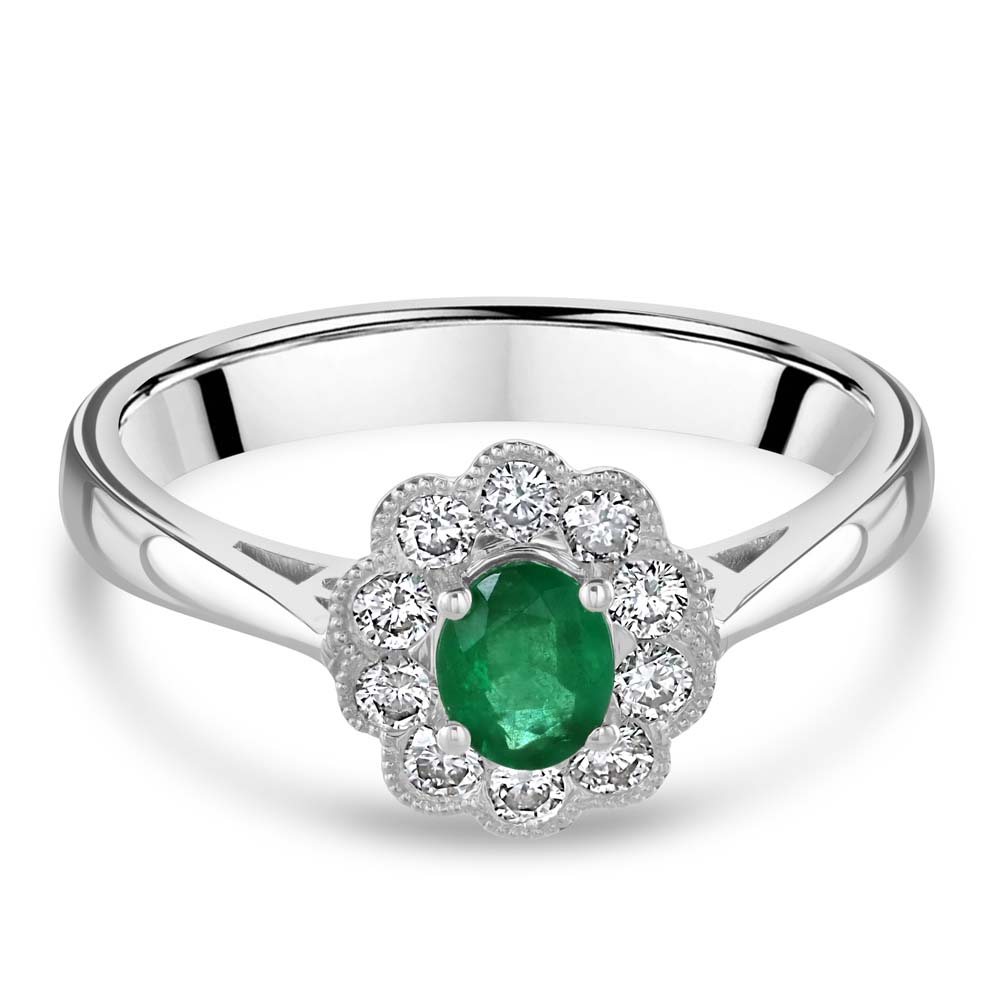 A timeless design with graceful vintage charm, this platinum wed-fit cluster ring features a vibrant 0.29ct oval cut emerald, claw-set at the centre to showcase its rich green hue. Surrounding the emerald are ten round brilliant cut diamonds, grain-set in a classic floral-inspired arrangement, enhanced by delicate milgrain detailing for added texture and elegance. With a total diamond weight of 0.27ct, this ring offers a refined sparkle that beautifully complements the emerald’s vivid colour. Designed with a wed-fit profile, it sits seamlessly alongside a wedding band, making it an ideal choice for bridal wear or a meaningful gift. A perfect blend of craftsmanship and sophistication, this ring is a celebration of enduring beauty and timeless style.
