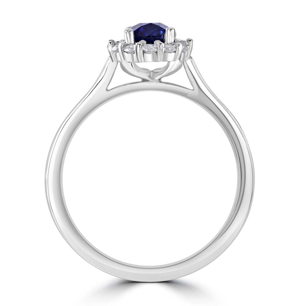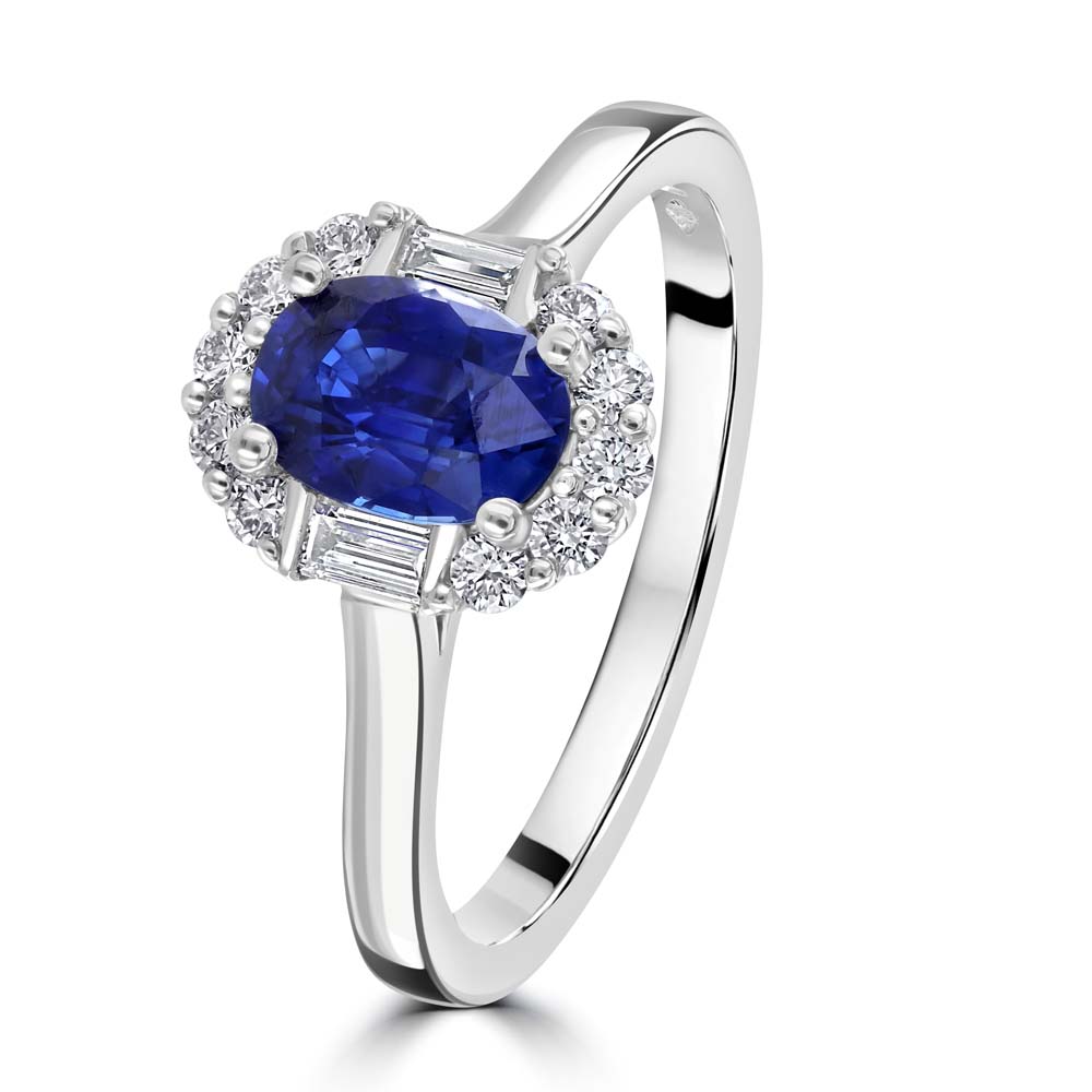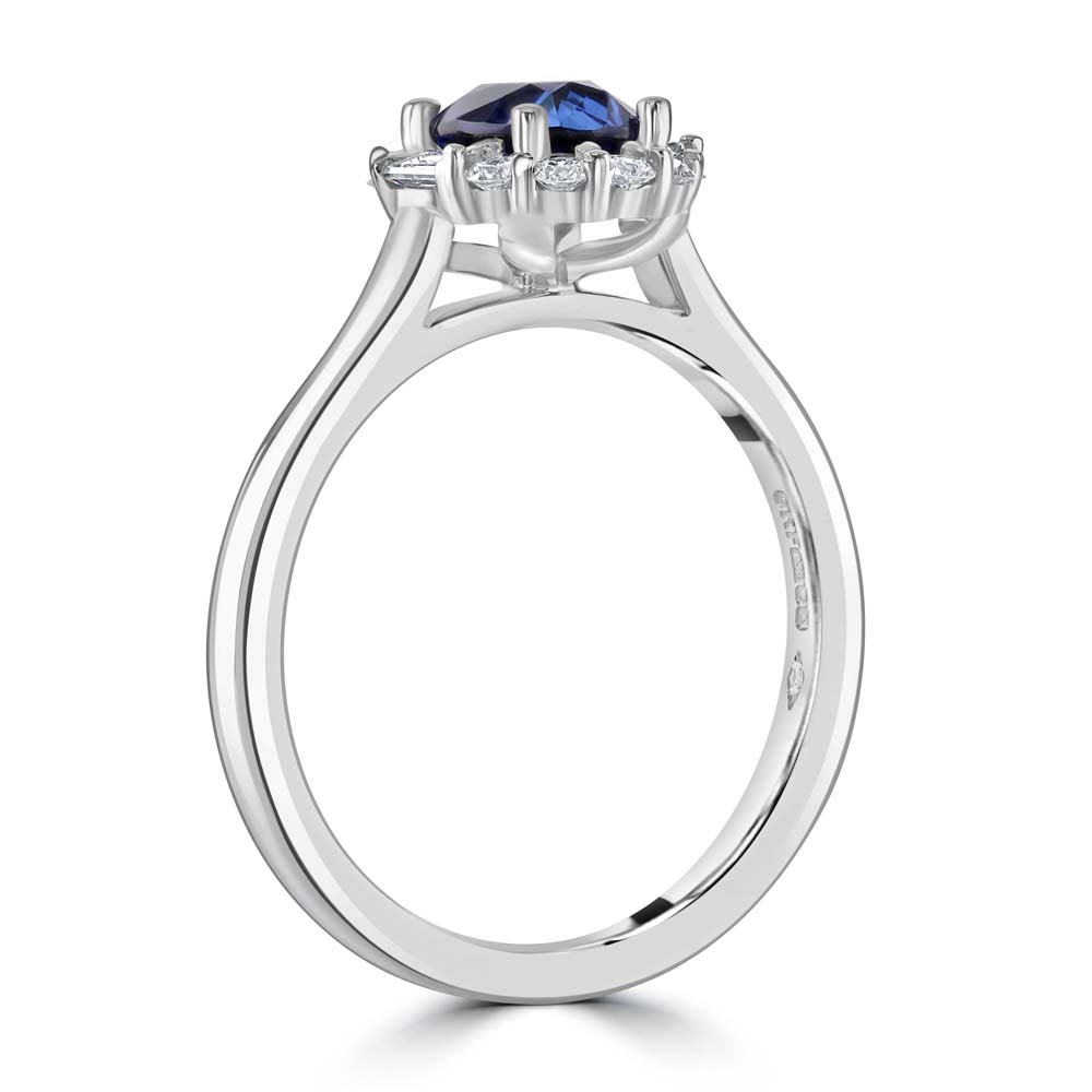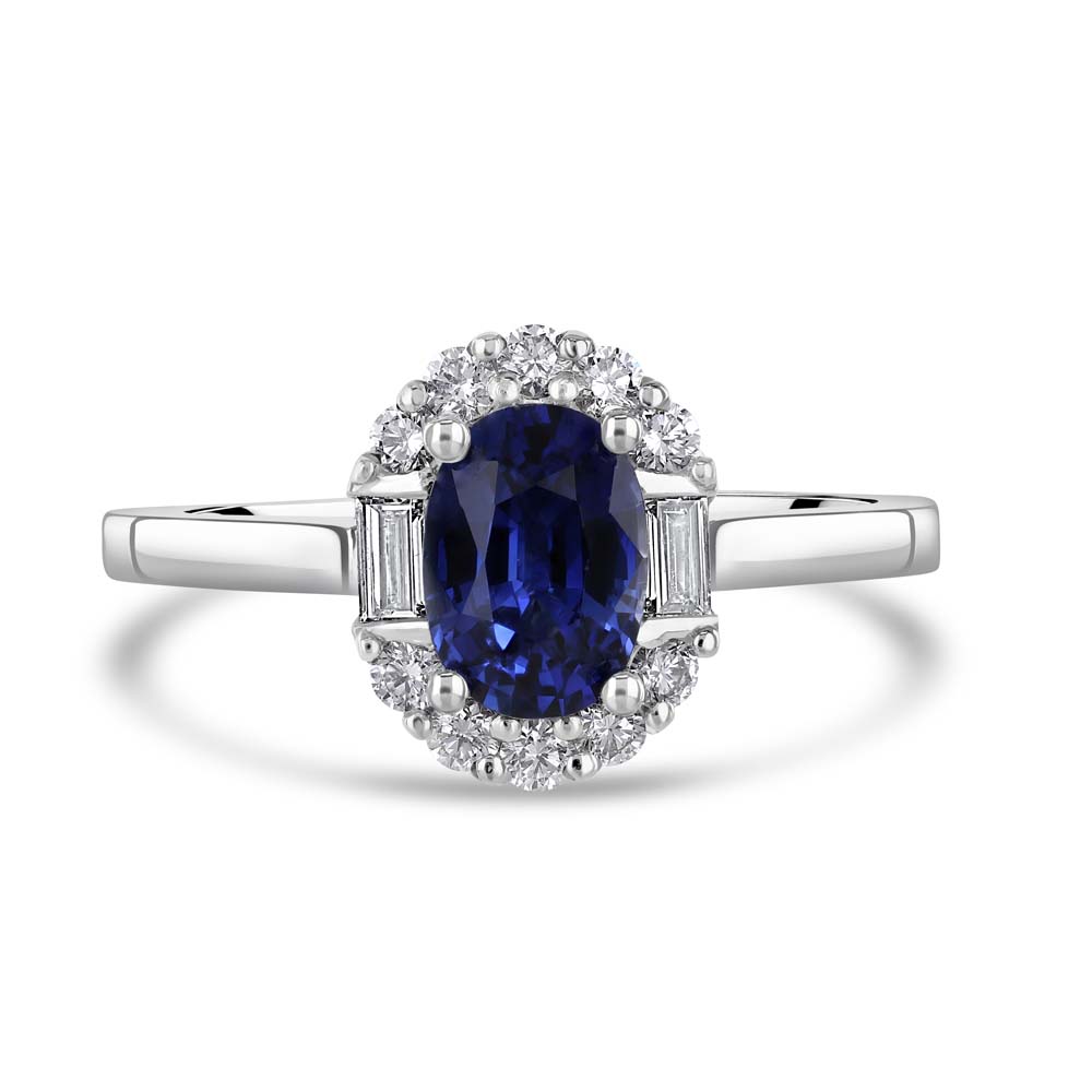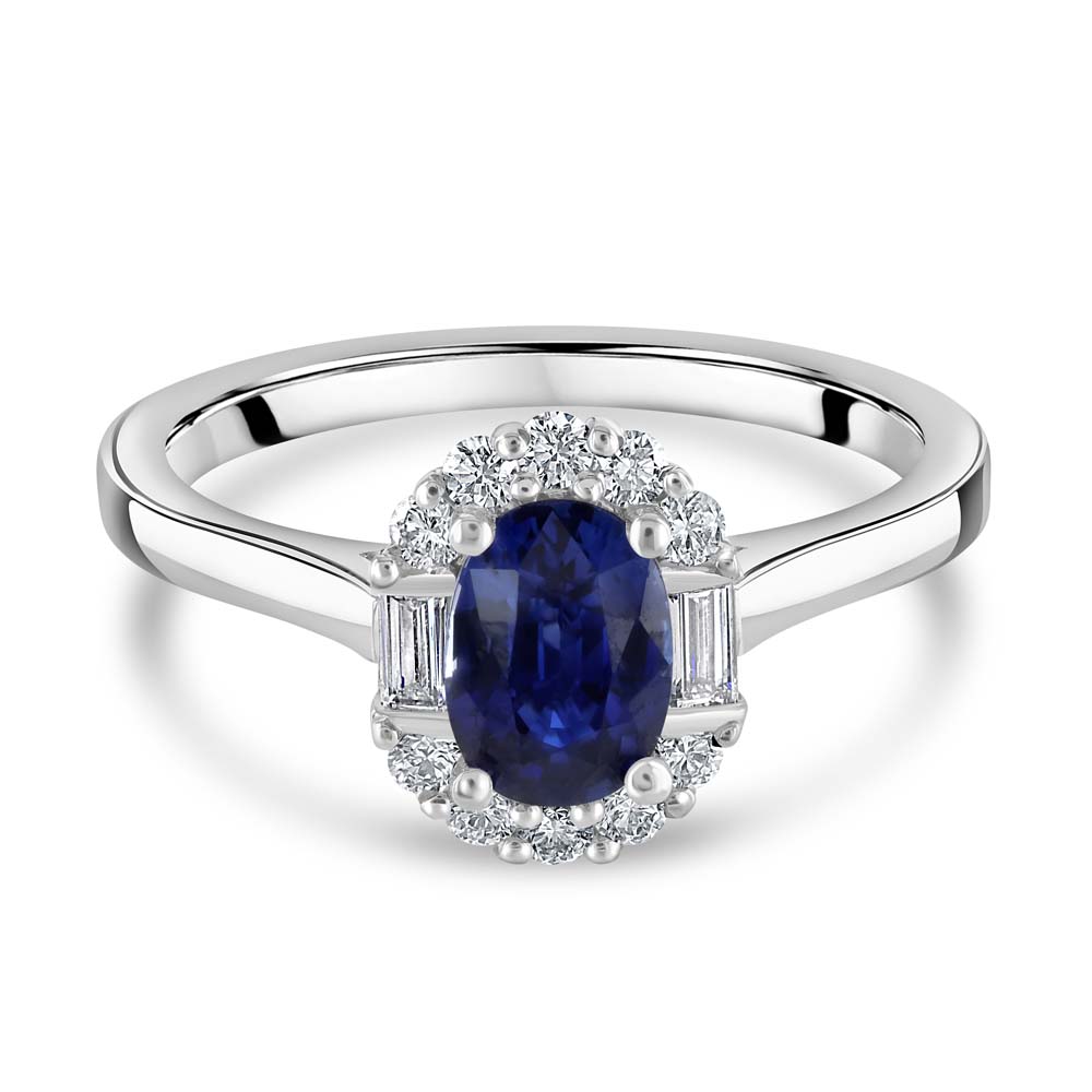 Our elegant platinum cluster ring showcases a captivating 1.01 carat oval-cut sapphire, claw-set at the centre to reveal its deep, velvety blue brilliance. Surrounding the sapphire are ten round brilliant-cut diamonds and two baguette-cut diamonds, meticulously arranged to create a harmonious halo of sparkle and symmetry. With a total diamond weight of 0.26 carats, each stone is precision-set to enhance light reflection and elevate the sapphire’s natural allure. The combination of round and baguette cuts adds depth and dimension, while the platinum setting offers a timeless, durable foundation for this exquisite design. Perfect for those who appreciate refined luxury and enduring beauty, this ring is ideal as a statement piece, an anniversary gift, or a treasured heirloom.
