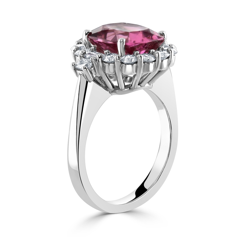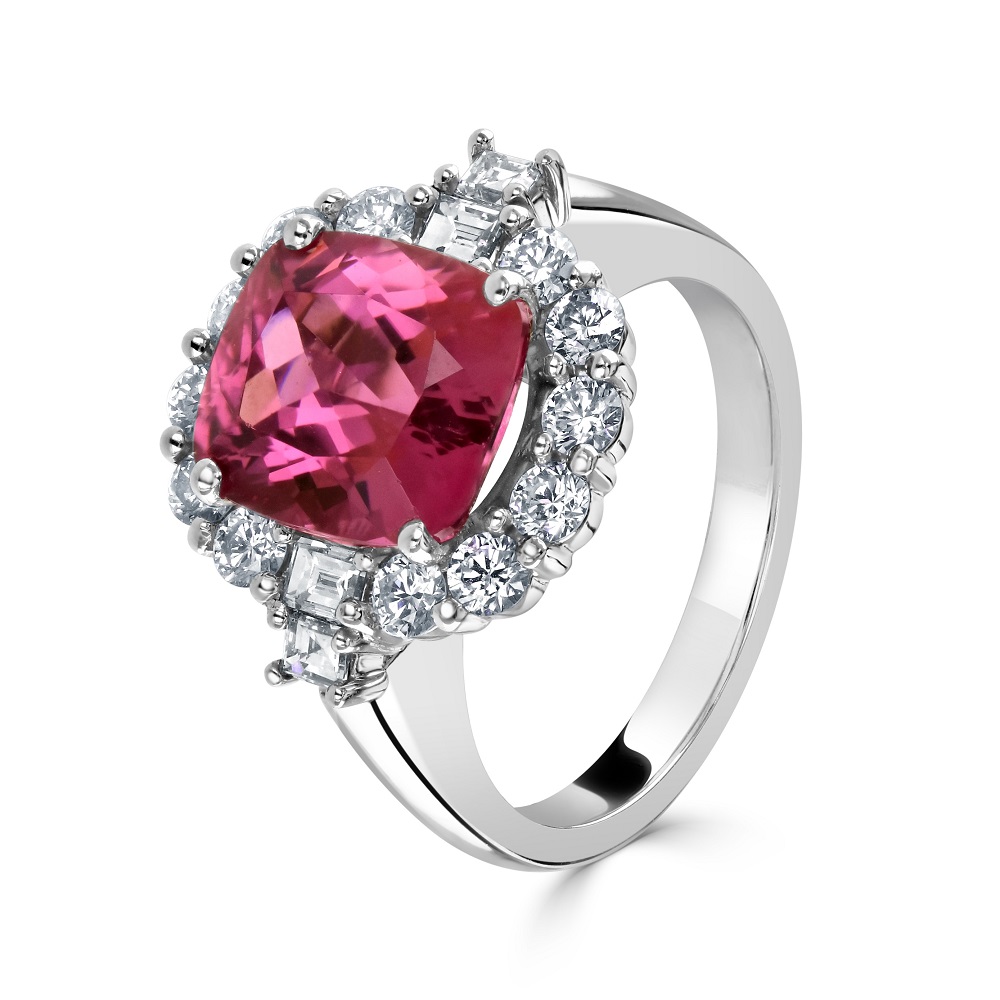 Our stunning platinum cluster ring is a symbol of luxury and sophistication. This exquisite piece showcases a captivating cushion-shaped pink tourmaline at its heart, weighing a generous 3.86ct. The vibrant hues of the pink tourmaline are beautifully accentuated by four secure claws, making it the centrepiece of allure and splendour.